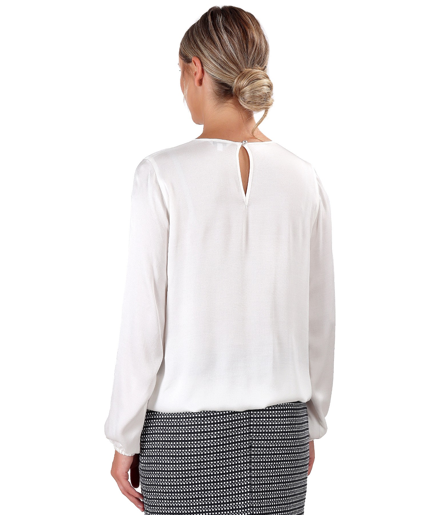 Elegant blouse made of slightly satin viscose, with long sleeves with elastic, with an elastic finish at the waist and decorative application in the shape of a heart at the neckline. It closes with a pearl button on the middle of the back.
