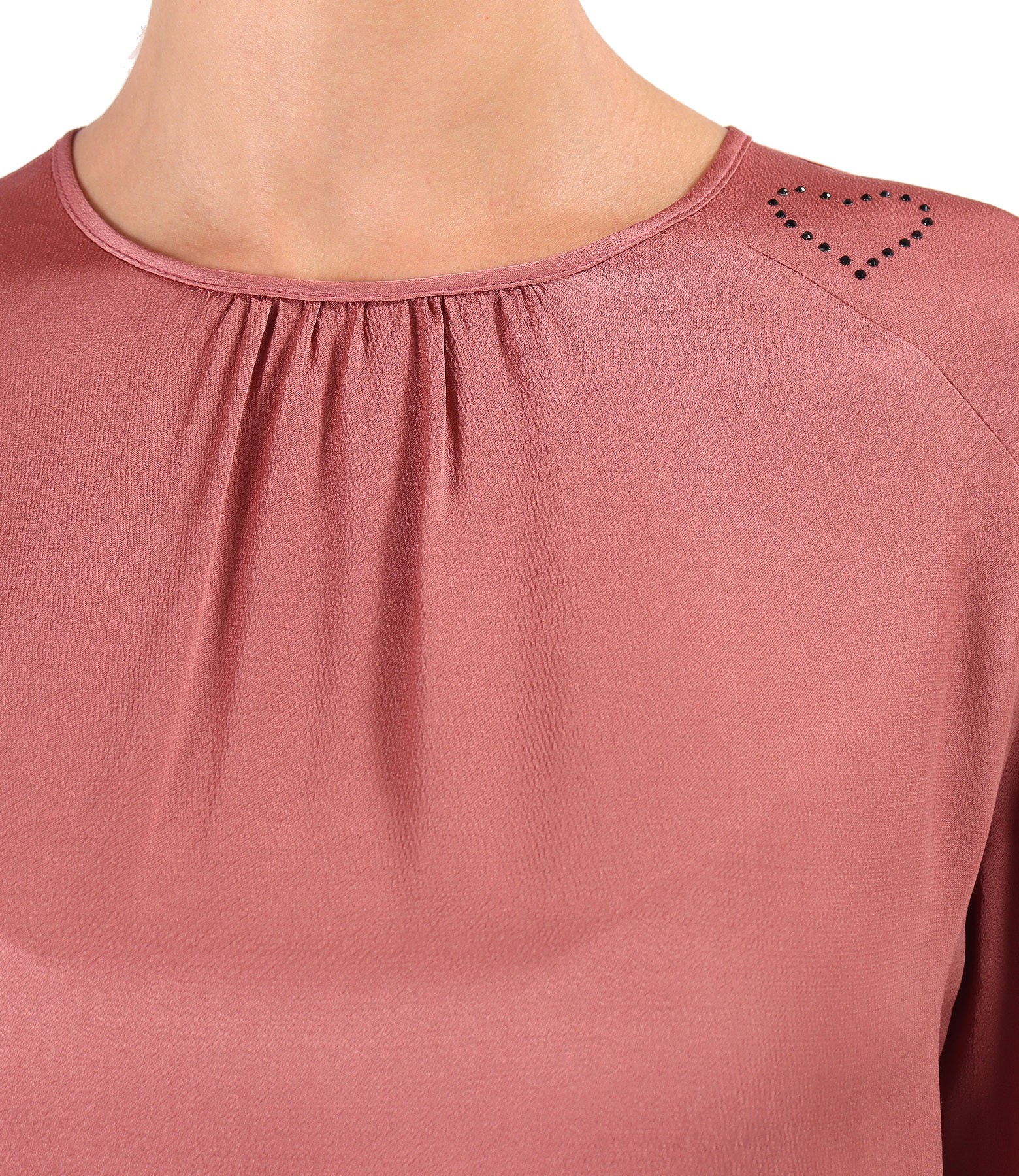 Elegant blouse made of slightly satin viscose, with long sleeves with elastic, with an elastic finish at the waist and decorative application in the shape of a heart at the neckline. It closes with a pearl button on the middle of the back.