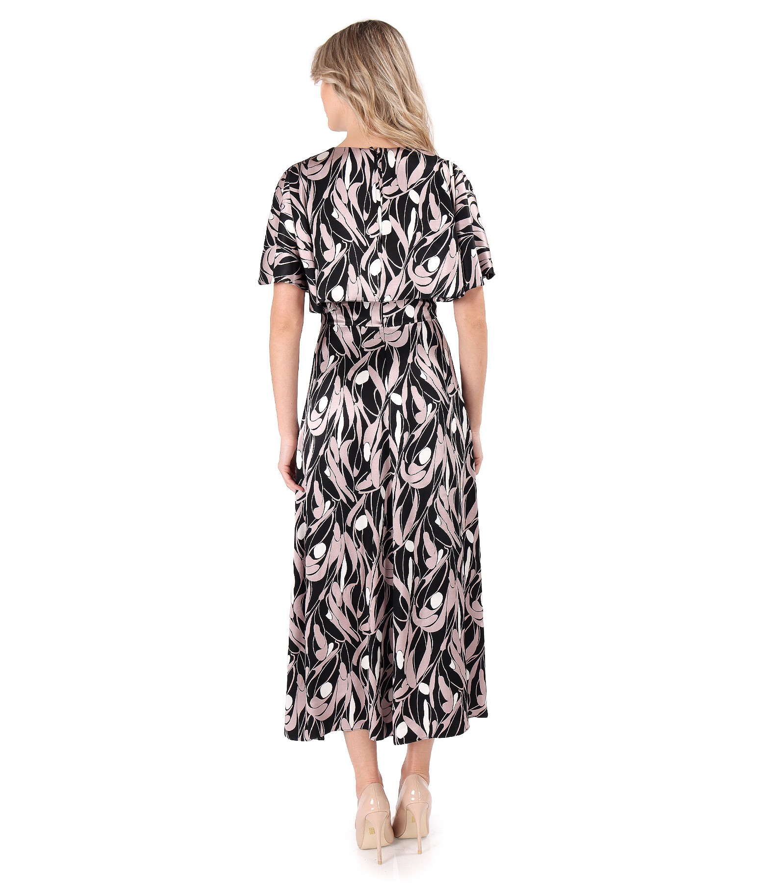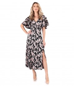 Elegant midi dress in digitally printed viscose satin with floral motifs, padded bust, front slit, deep V-neckline and wide sleeves. It closes with a hidden zipper in the middle of the back.