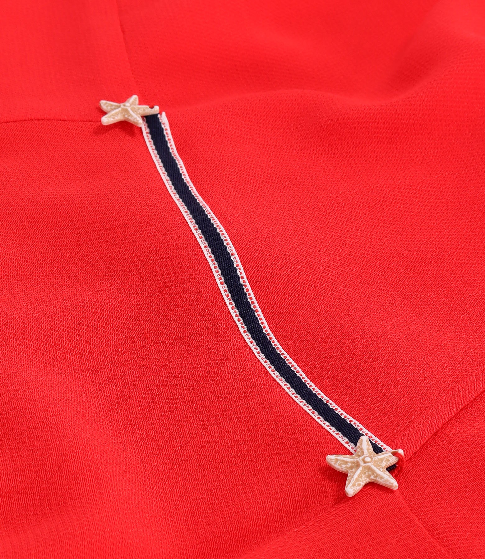 Viscose dress with dropped sleeves and spent breast,doubled with viscose,with rips band and starfish at the waist.It closes with a zipper hidden in the middle of the back.