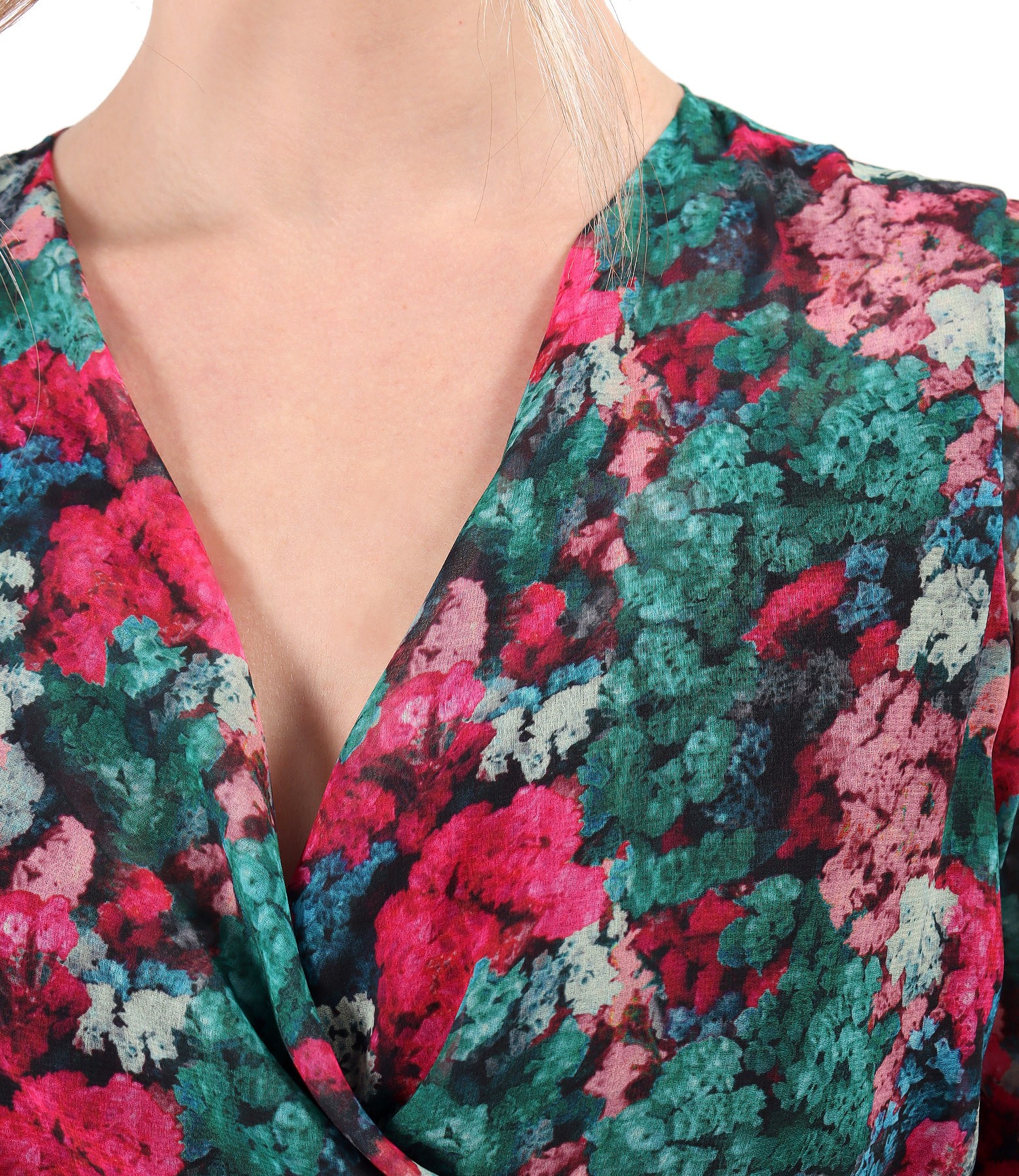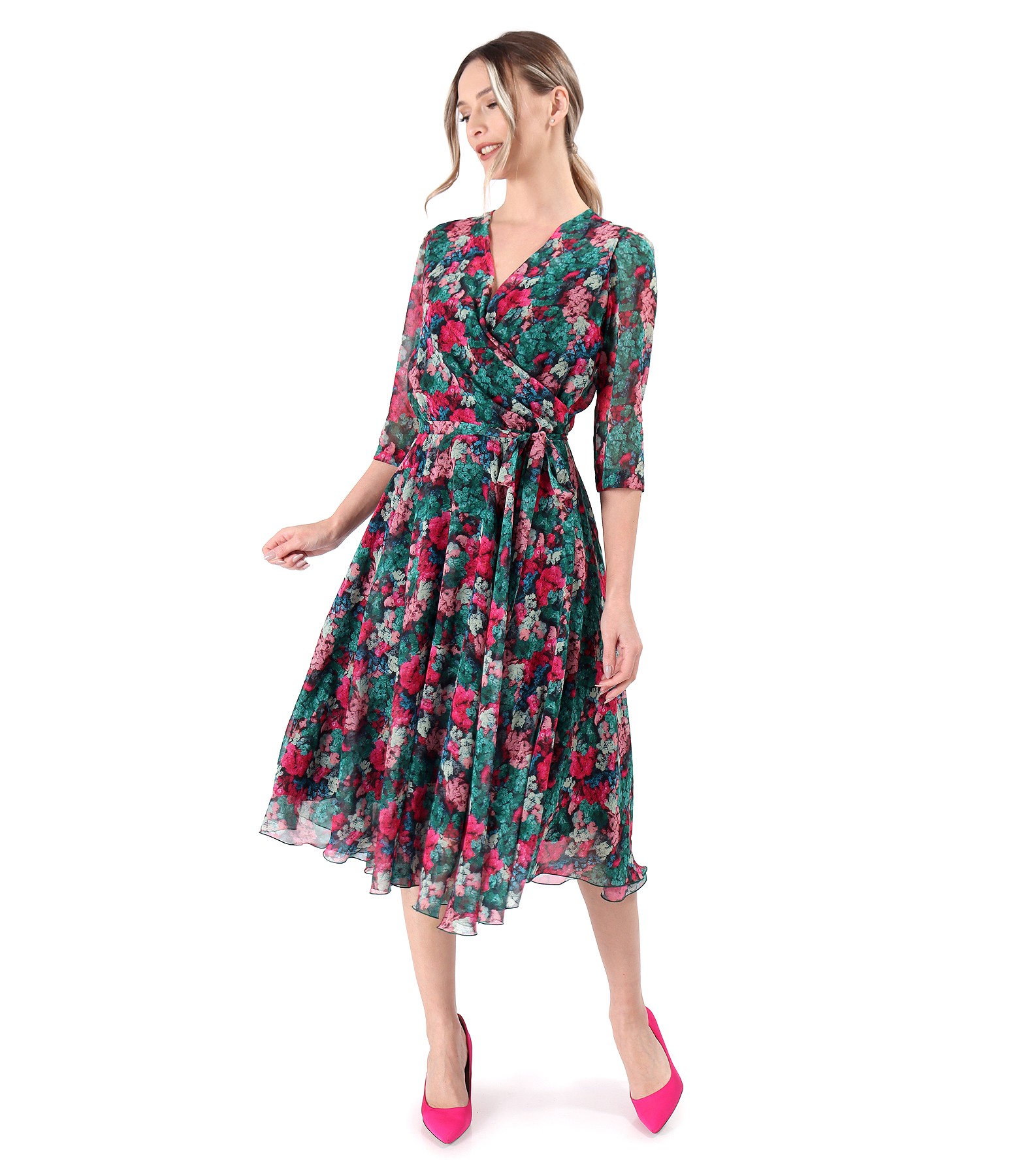 Elegant dress made of printed voile, padded with viscose, with drawstring at the waist and 3/4 sleeves. It closes with a hidden zipper in the middle of the back.