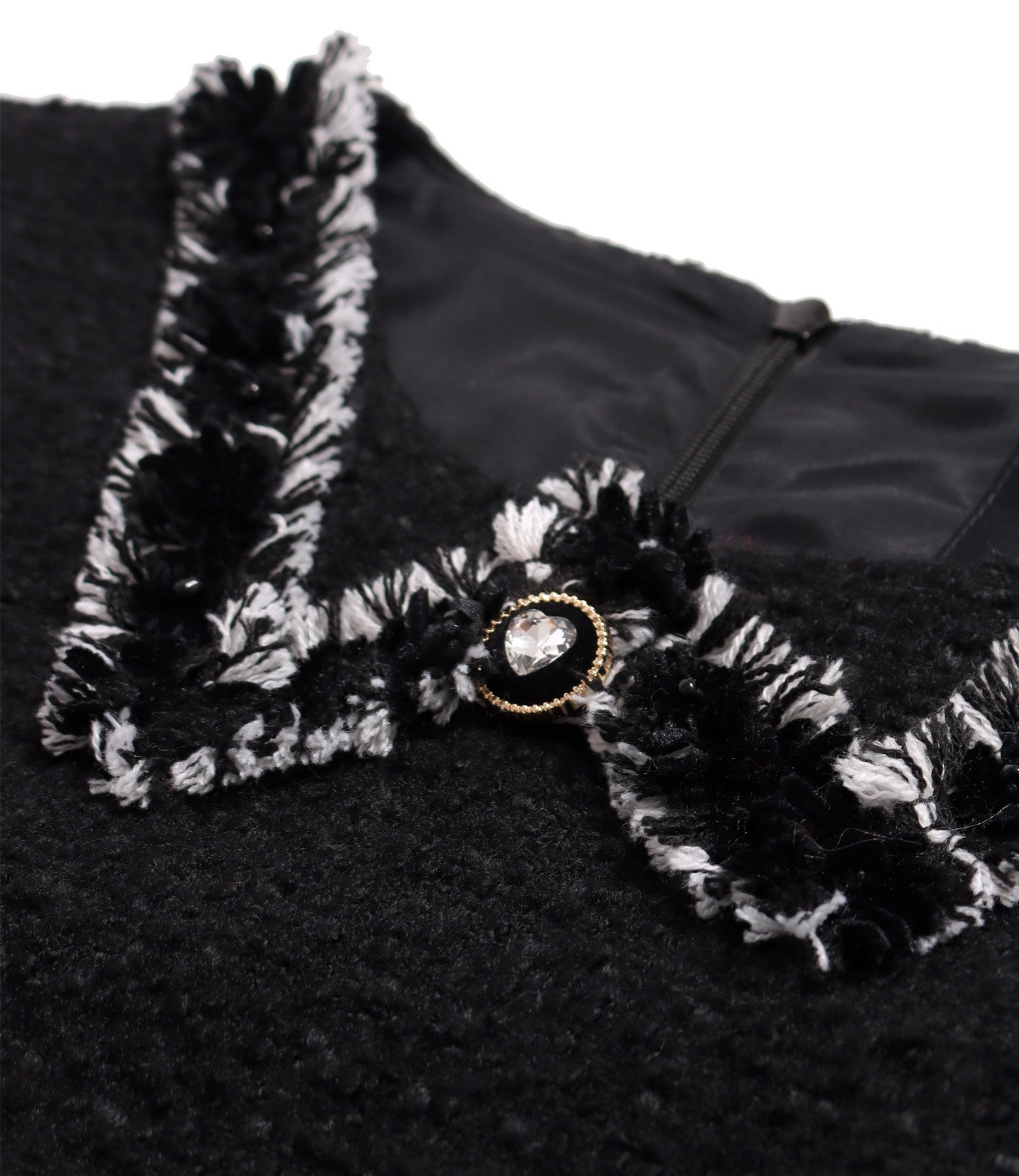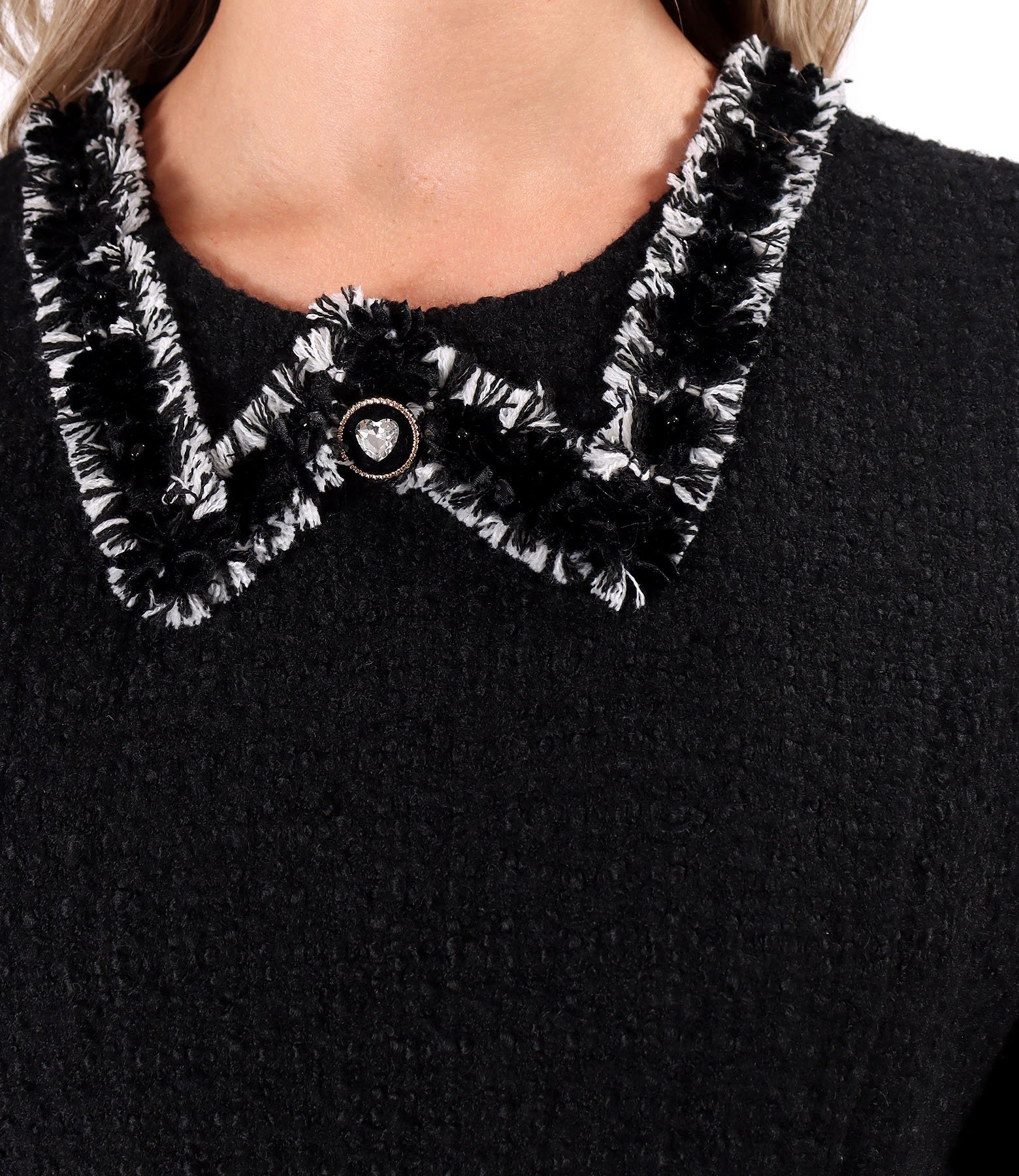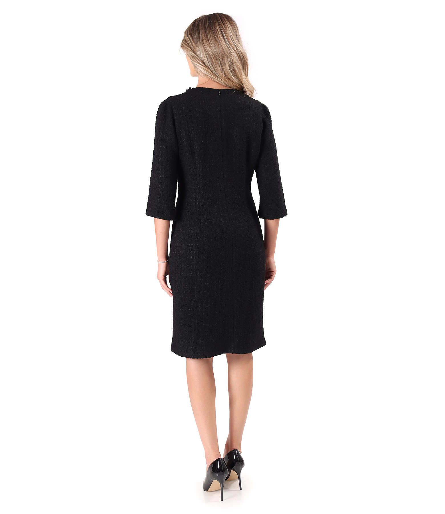 Elegant wool dress, lined, with a round neckline, 3/4 sleeves and decorative button trimming at the neckline. It closes with a hidden zipper at the center back.