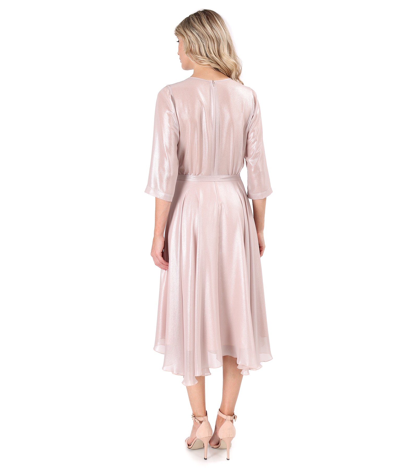Satin veil evening dress, padded with viscose, with 3/4 sleeves and waist belt. Closes with hidden zipper on the middle back.