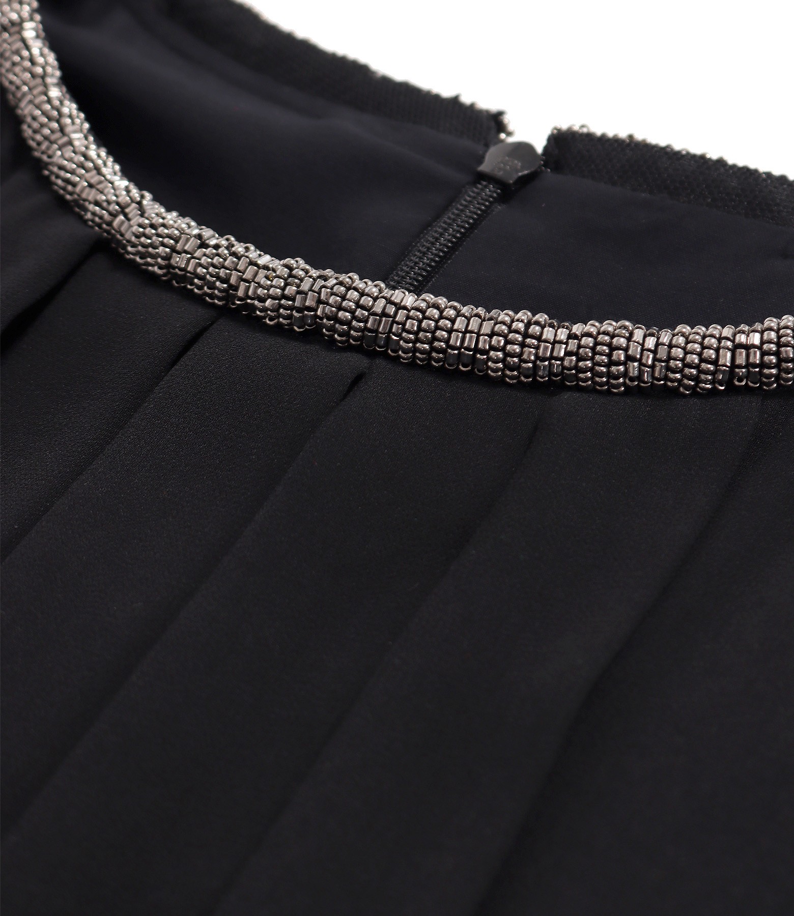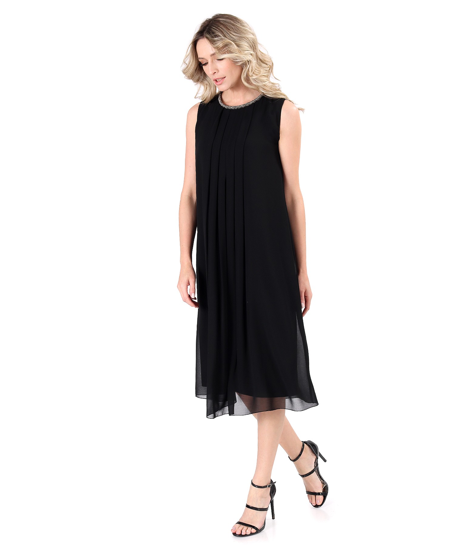 Evening dress in veil with pleats on the front, round neckline with tubular beaded collar. It closes on the back with a hidden zipper.