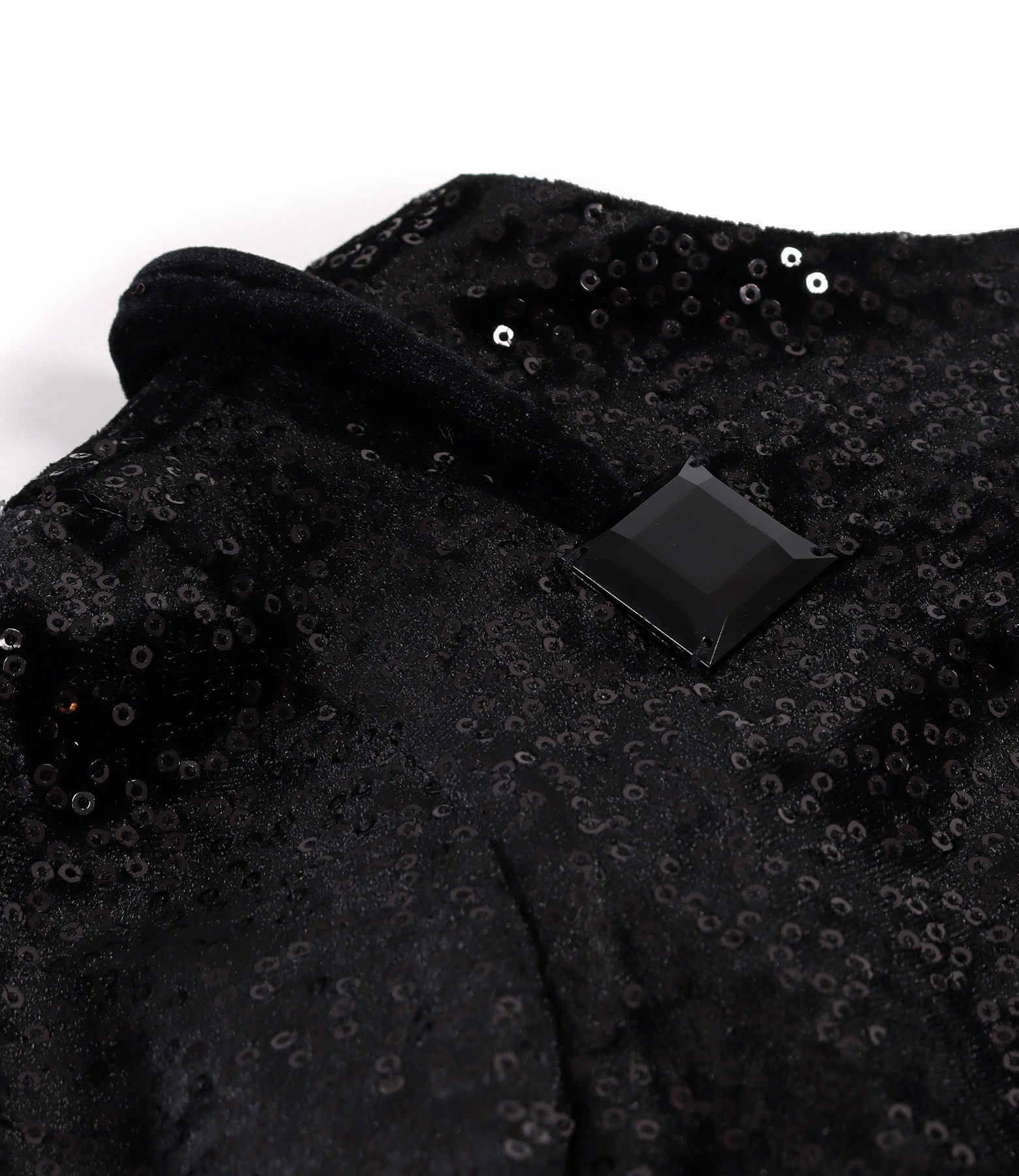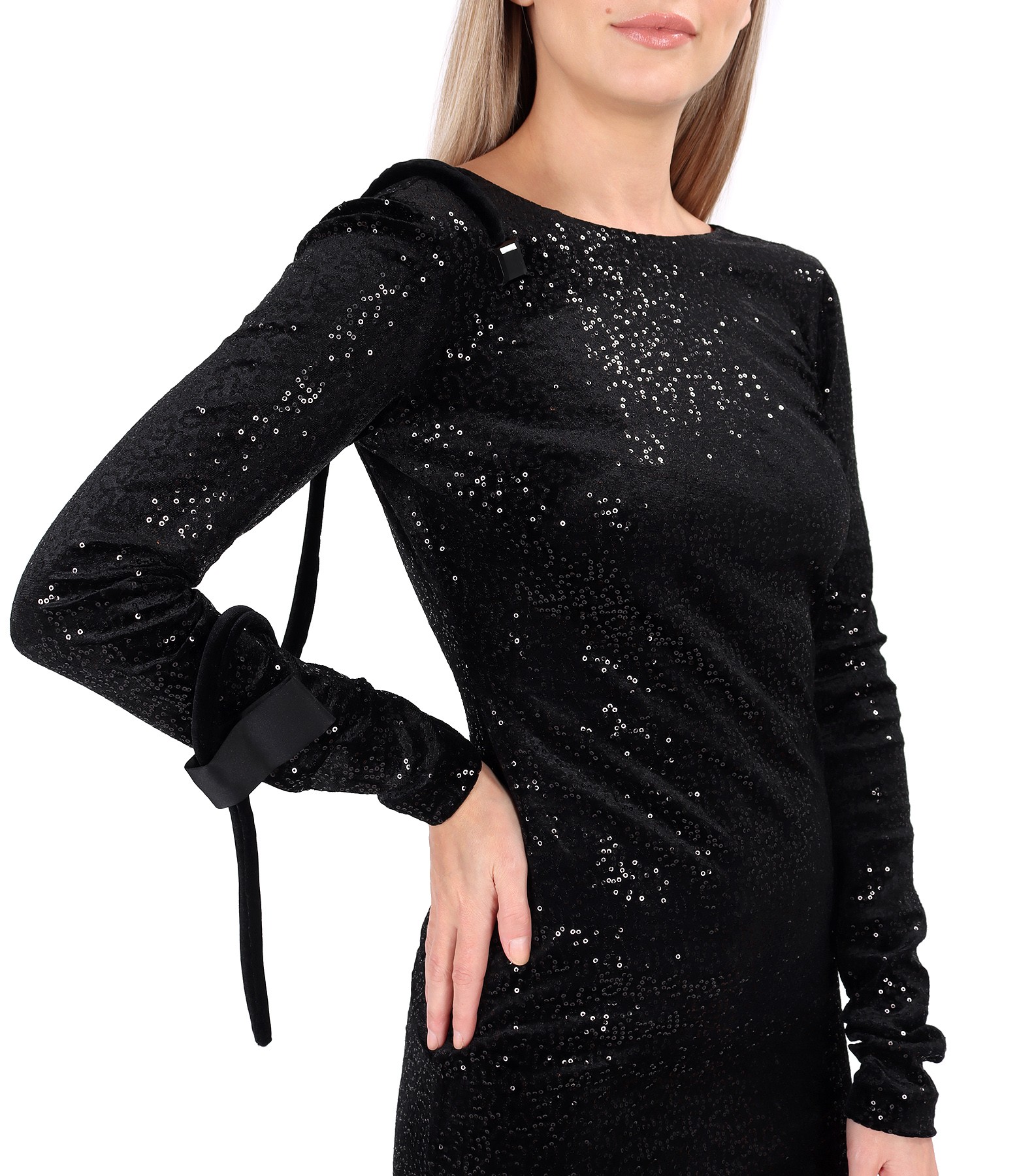 Velvet evening dress with sequins with deep V-neckline at the back, padded, with extra-long sleeves, wrinkled at the ends. With sophisticated accessories made of velvet, satin, and black geometric stone on the right shoulder. Decorative slit on the left side finished with satin. It has no closing system.