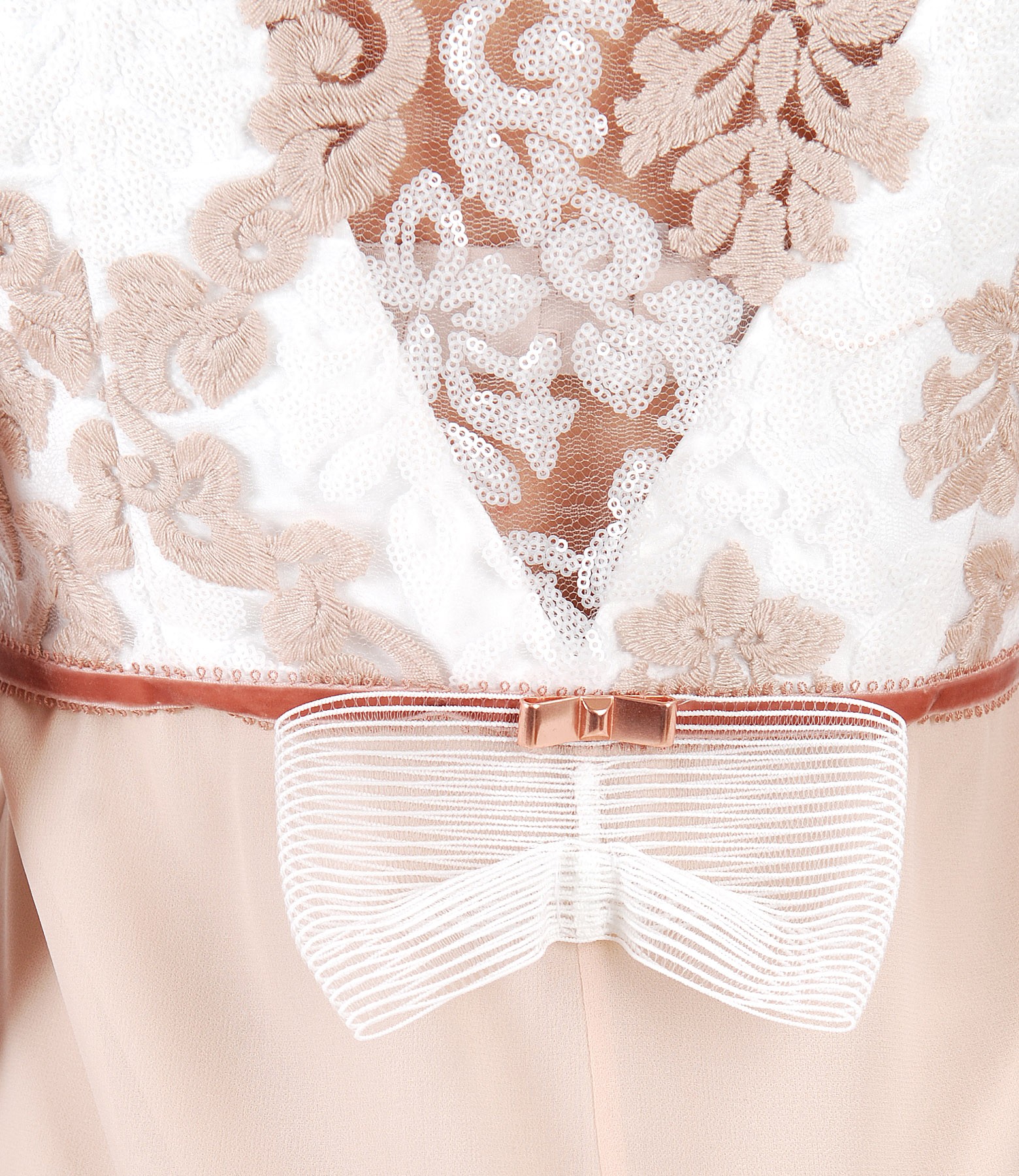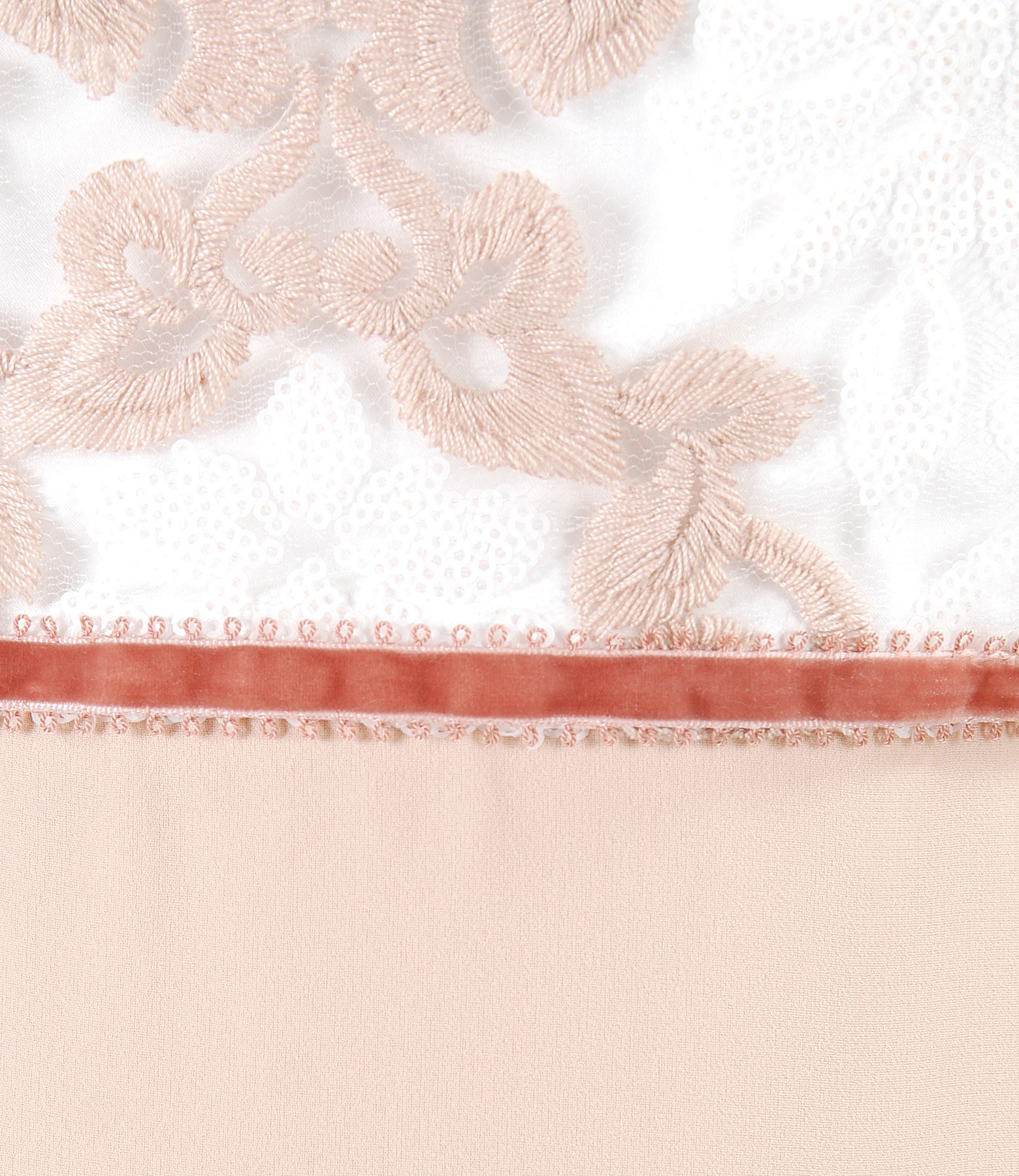 Evening dress, with veil skirt, doubled with satin and lace corsage with sequins. Have velvet belt and organza bow. Closes with hidden zipper on the left side.