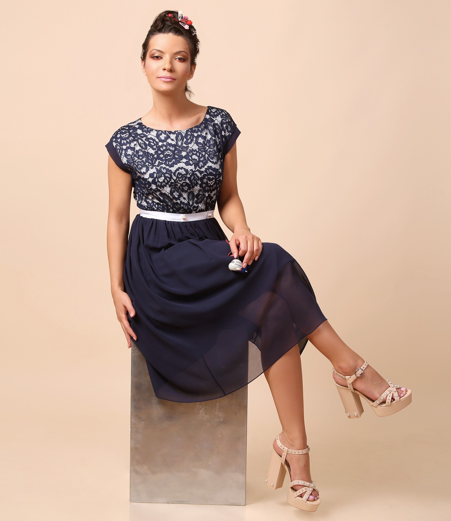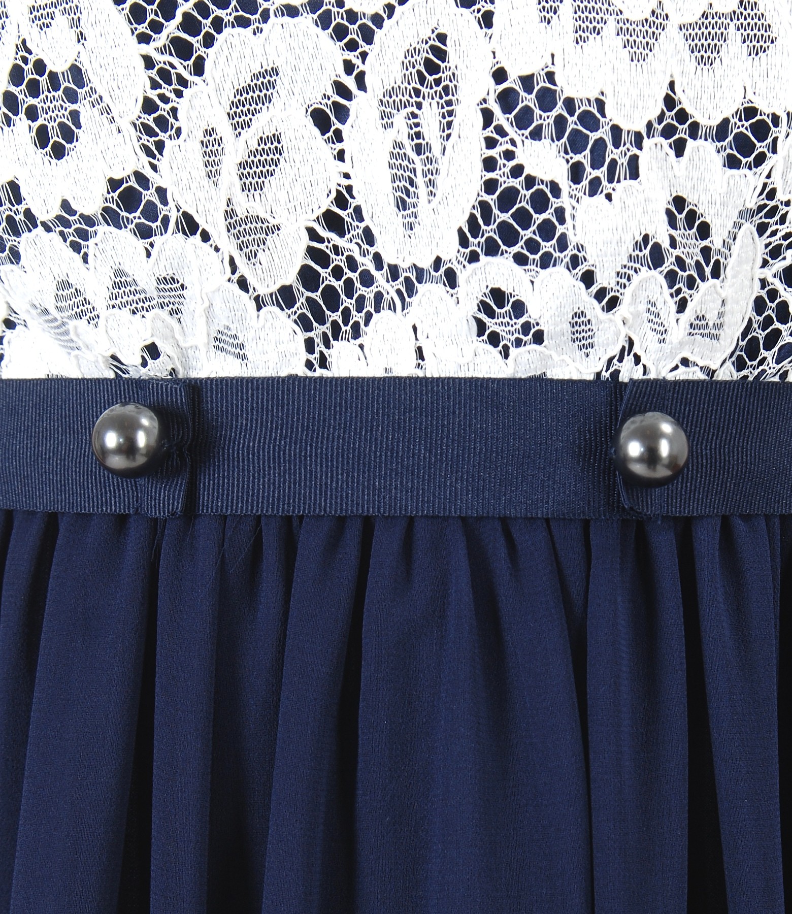 Evening dress with floral lace and pearls (White-Dark blue), size