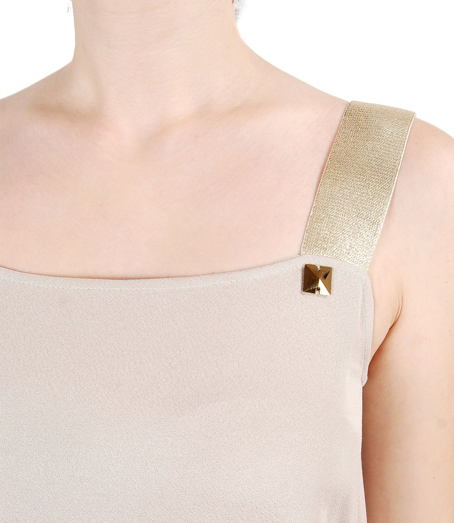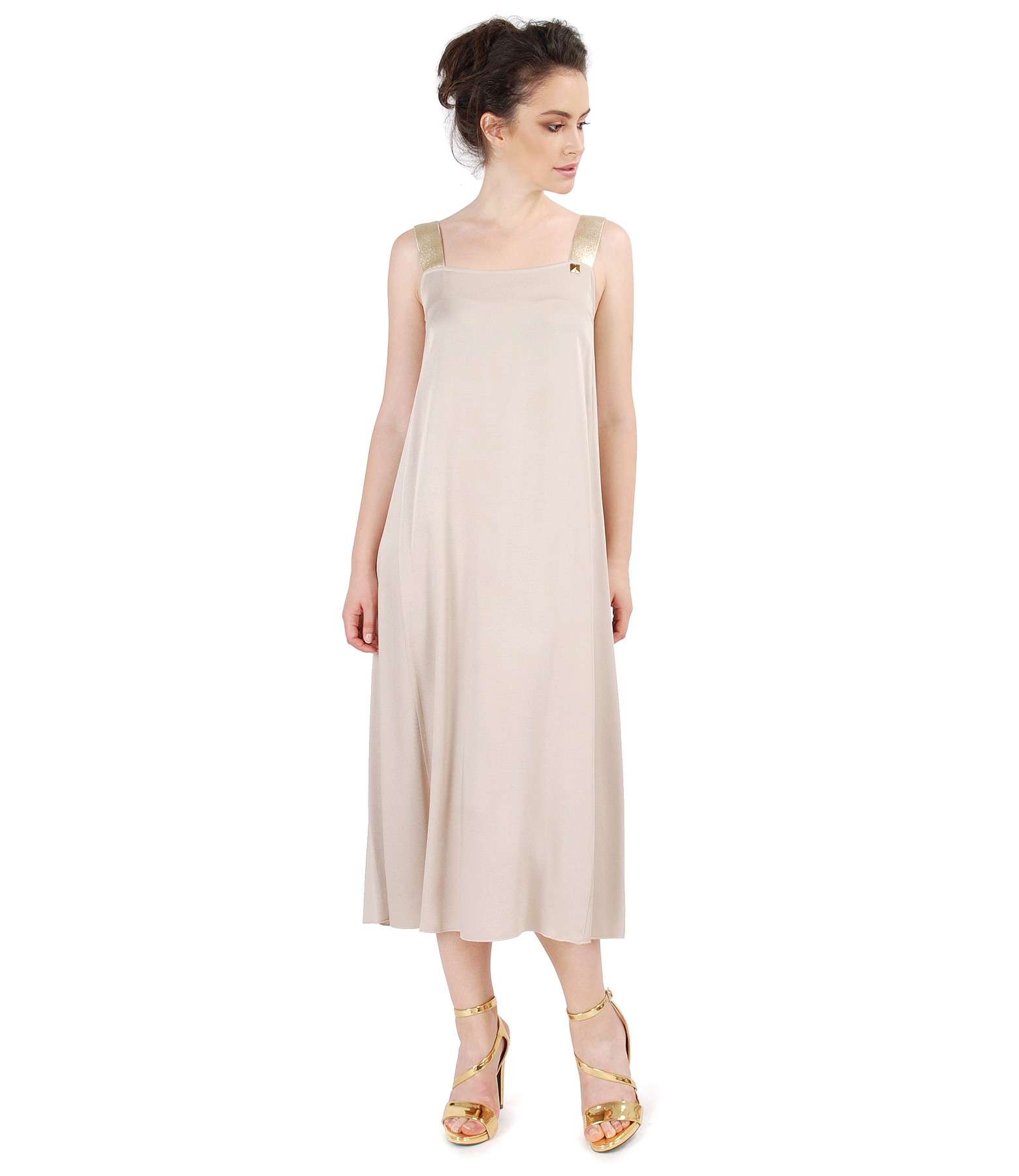 Evening dress in full viscose, unlined, with golden braces, embellished with crystals on the left shoulder. Has no closing system.