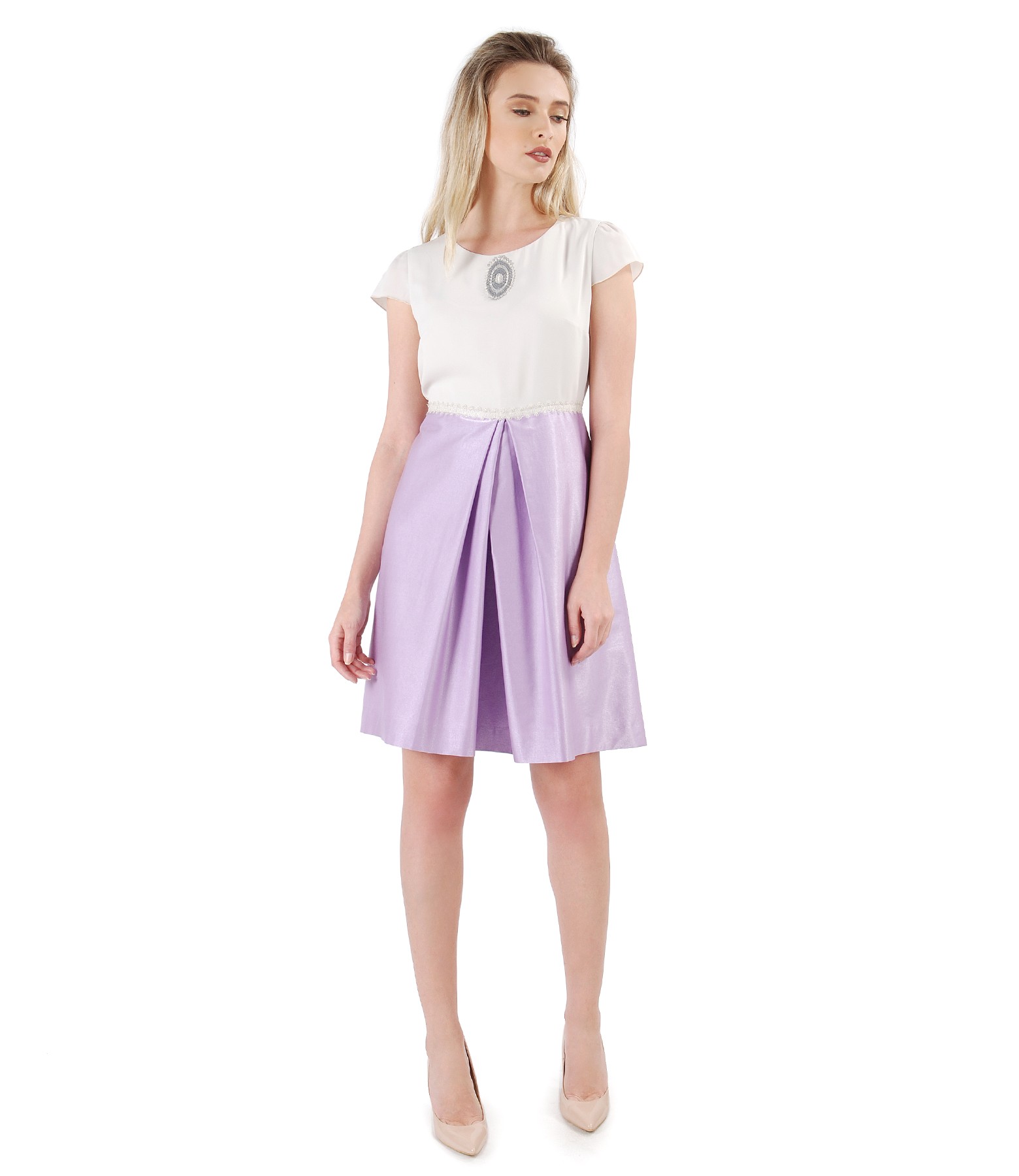Evening dress with lace on decolletage, padded, with flaring skirt with folds and lace waist belt. Have veil corsage and short sleeves. Closes with hidden zipper and button on the middle back.