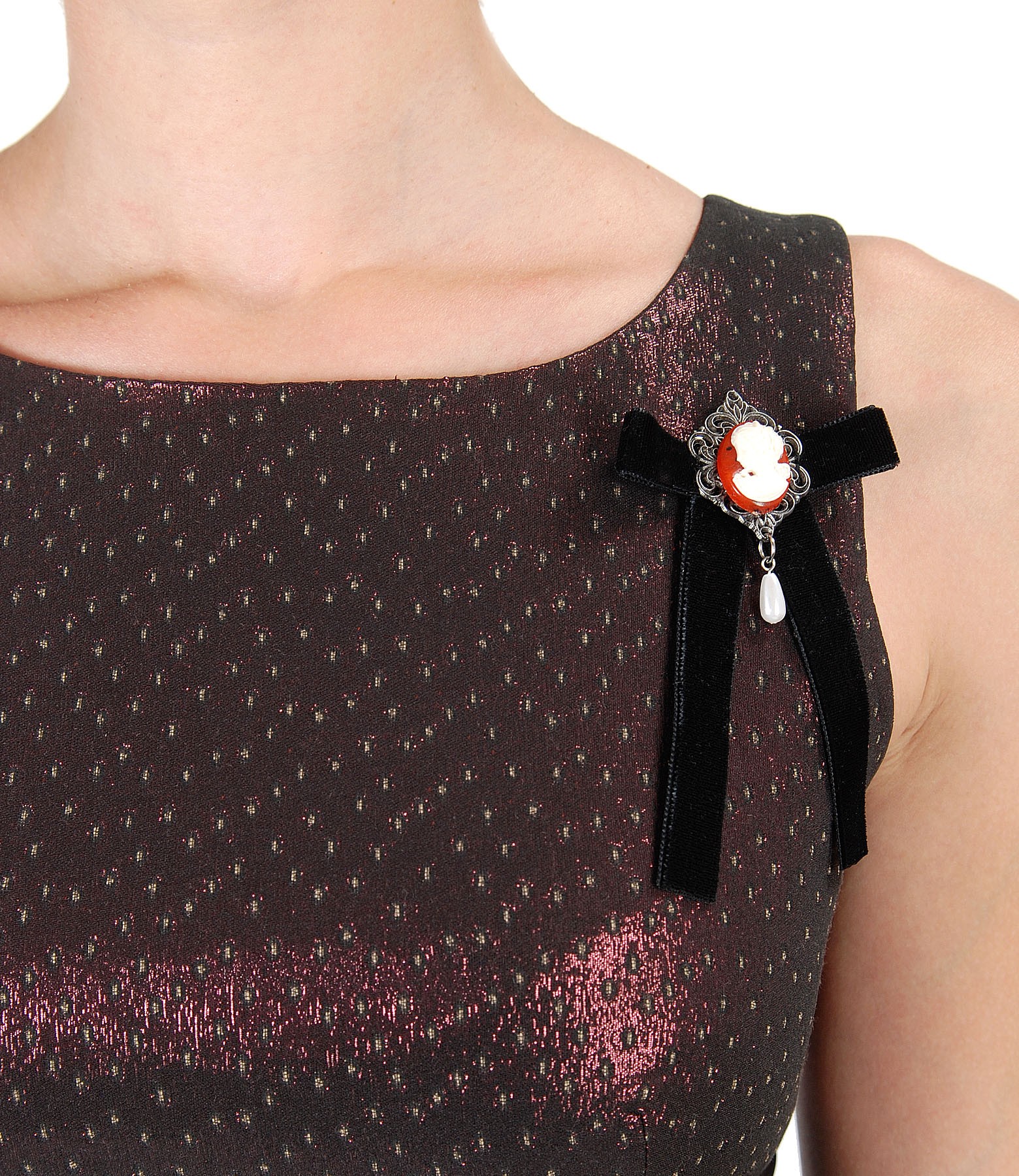 Evening dress with velvet and accessory brooch