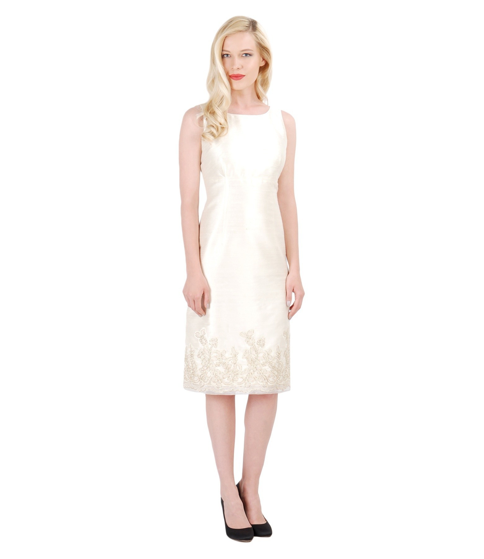 Short evening silk taffeta dress, sleeveless, cut in waist, slightly flaring. Middle-back concealed zip fastening.