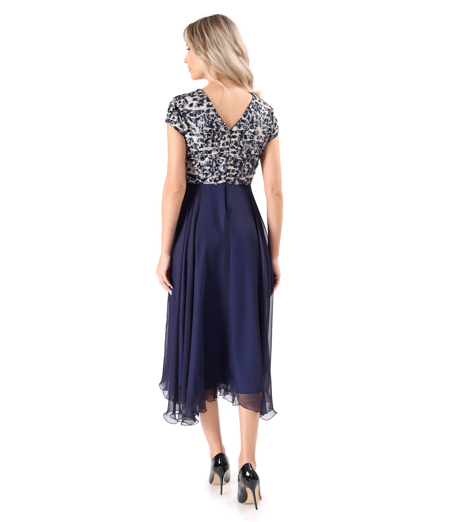 Evening veil dress with sequins corsage , doubled with satin, short sleeves and V front and back low-cut neck. Closes with a hidden zipper on the left side.