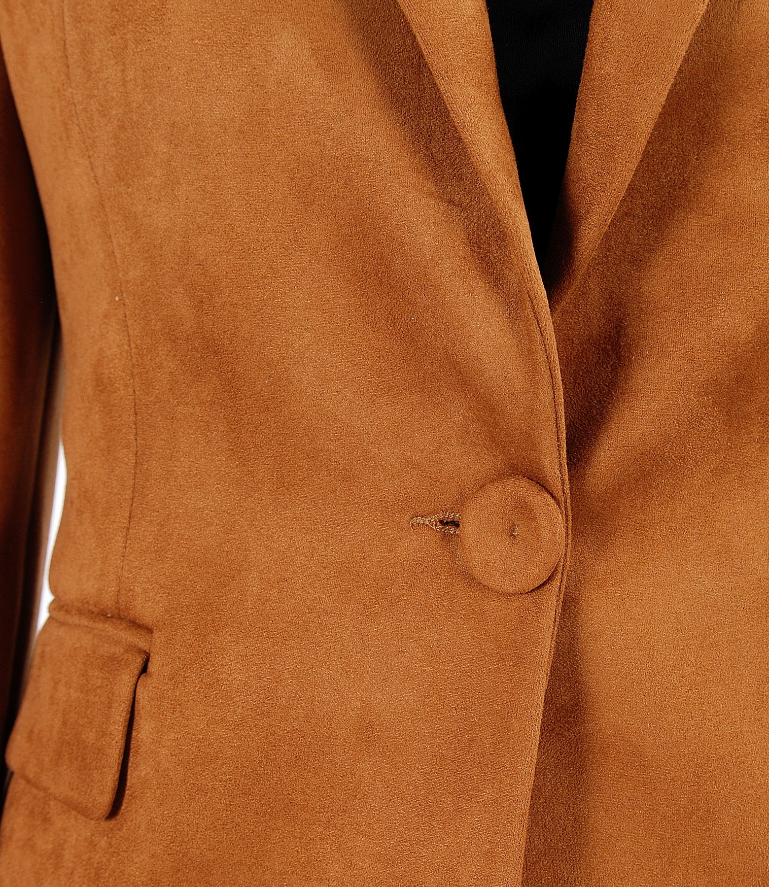 Fabric jacket with velvet look, V deep low-cut neck, with two front flaps. Collar and edged lapels. Closes with a button on the middle front.
