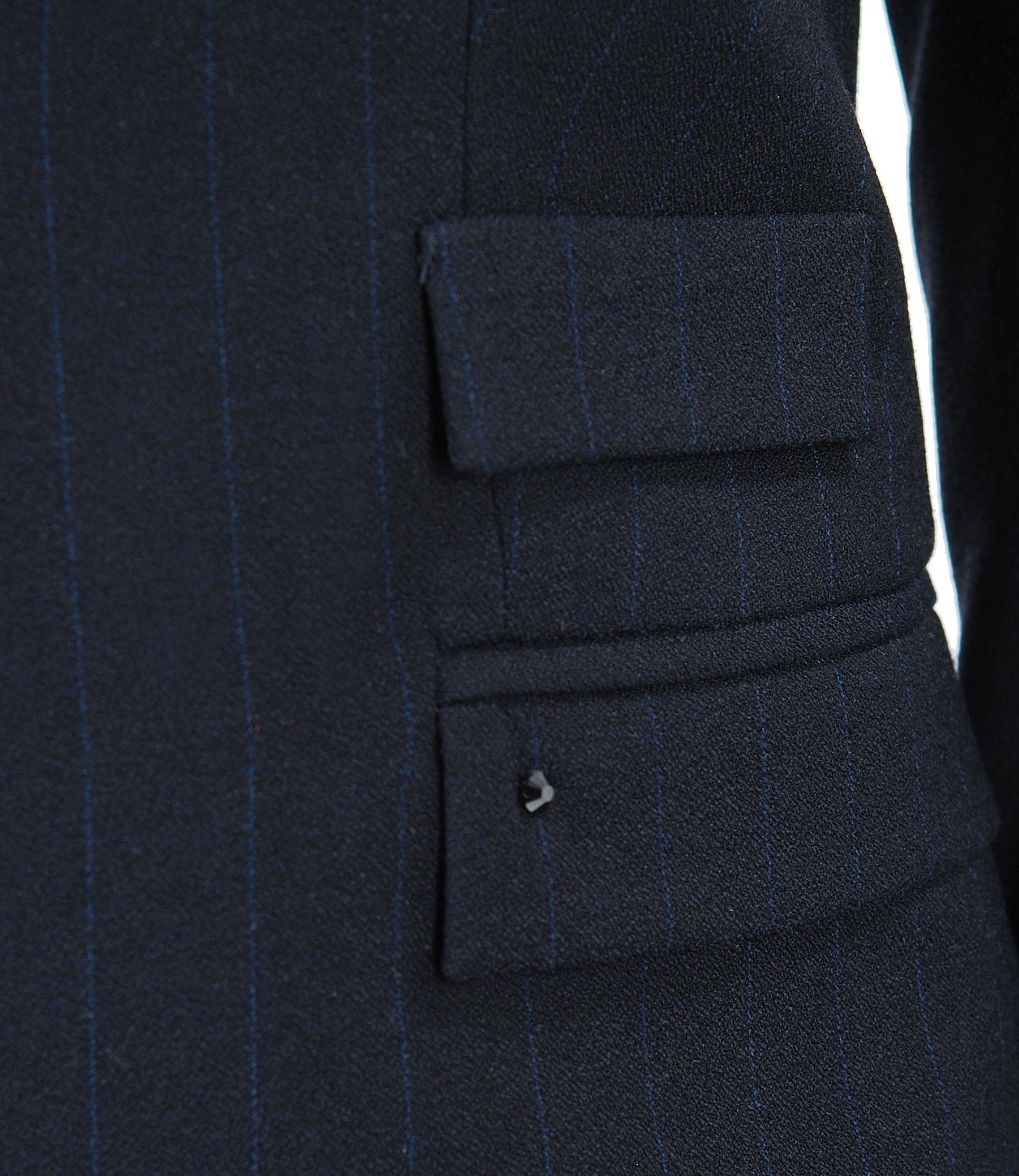 Fabric office jacket with stripes, coated, with pockets with flaps and welt pockets with inserts. Closes with a button on the middle front.