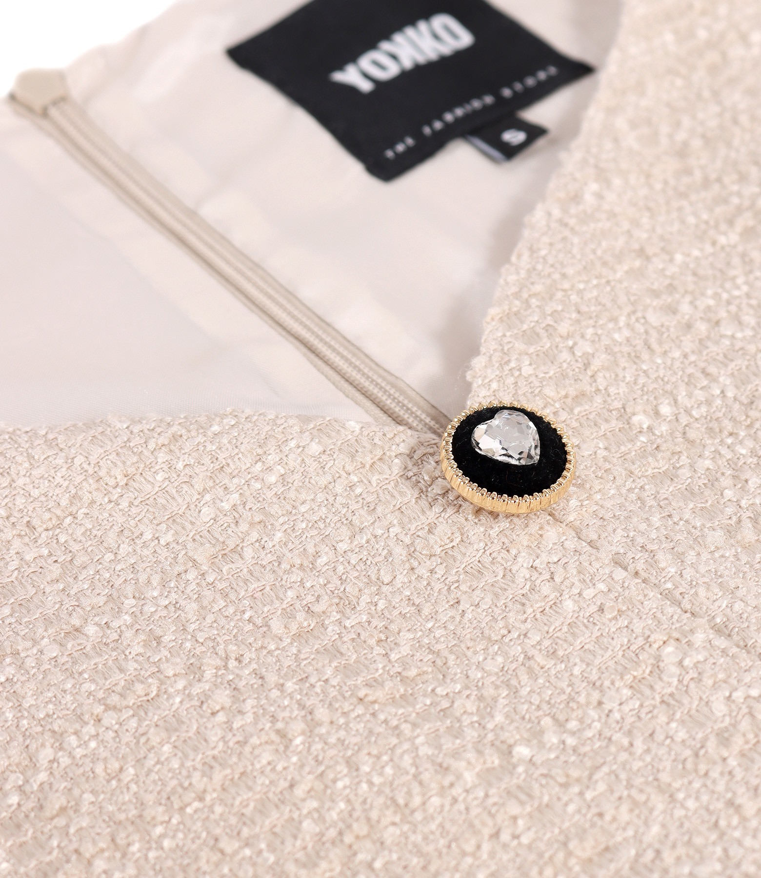 Flared dress made of loops with viscose and cotton, padded, sleeveless, and with a decorative button at the neckline. It closes with a hidden zipper in the middle of the back.