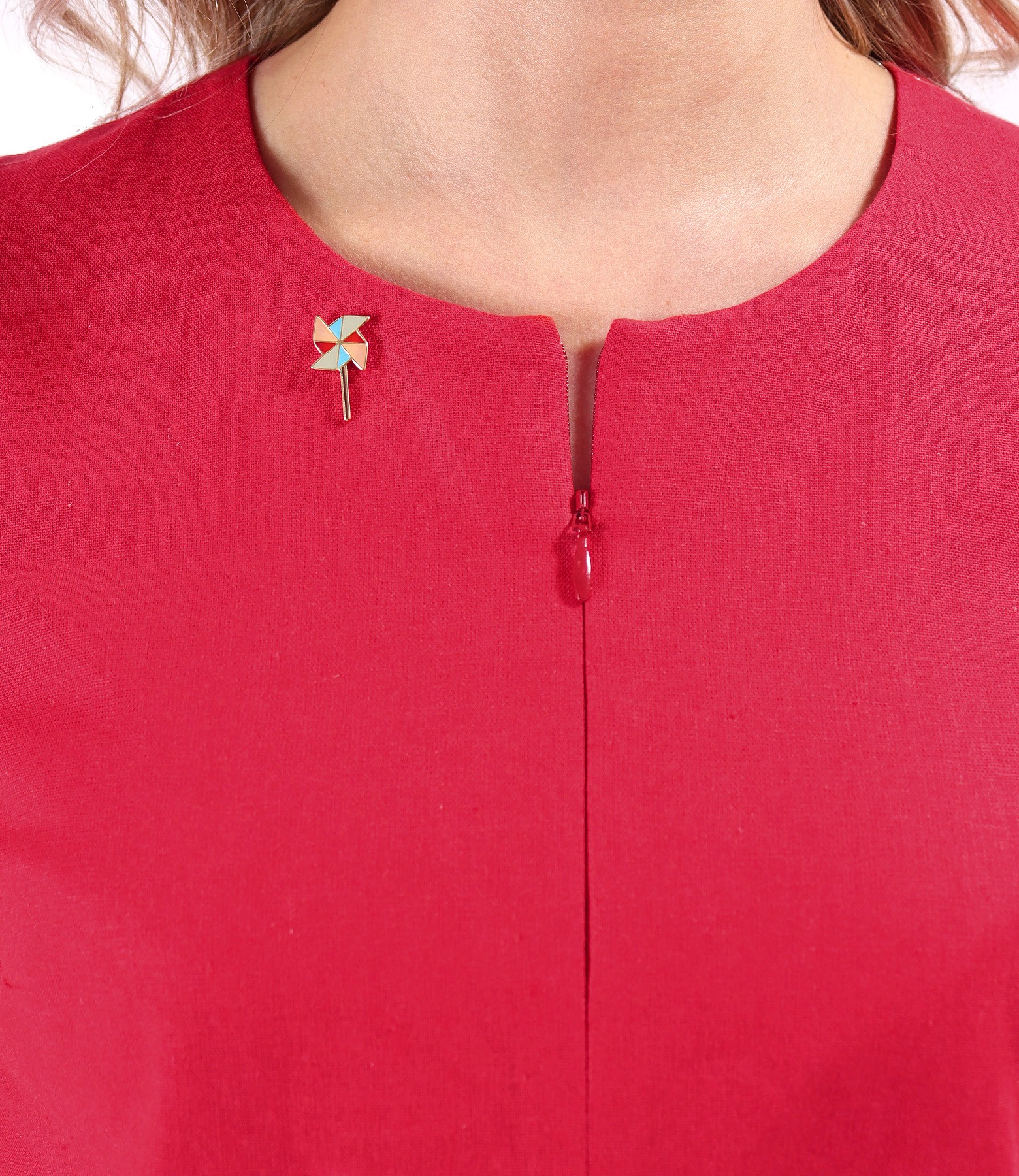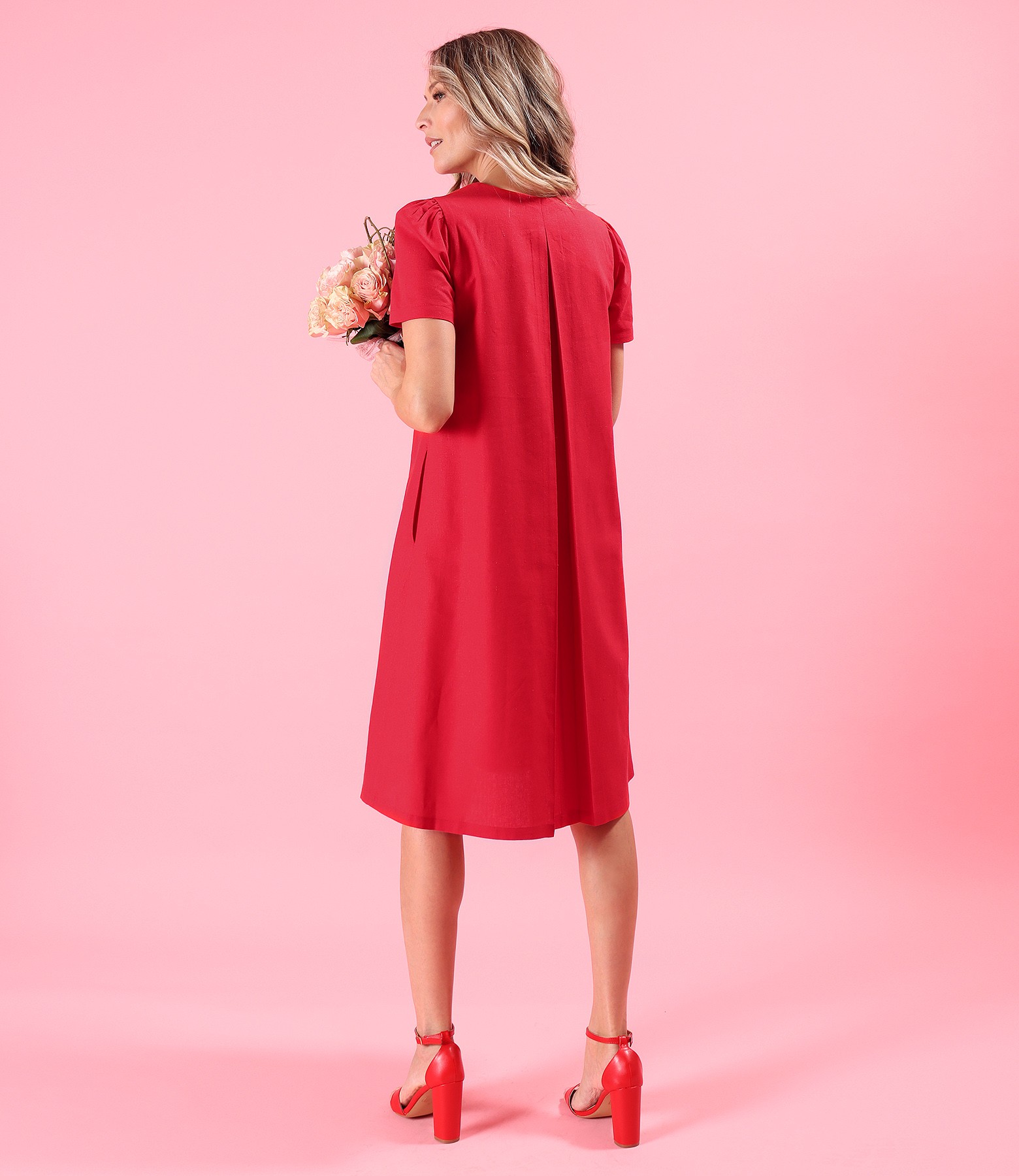 Flared dress made of linen and, with short sleeves, a round neckline with a zipper, and a decorative pin. The dress has a pleat at the center back.