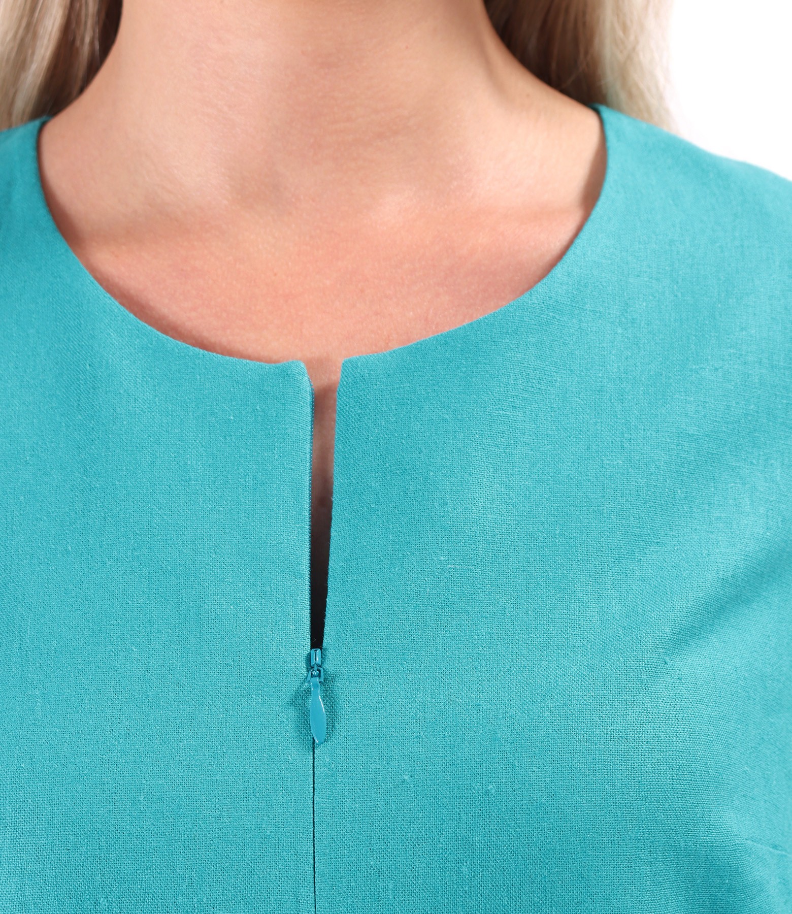 Flared dress made of linen and viscose, with short sleeves, a round neckline with a zipper. The dress has a pleat at the center back.