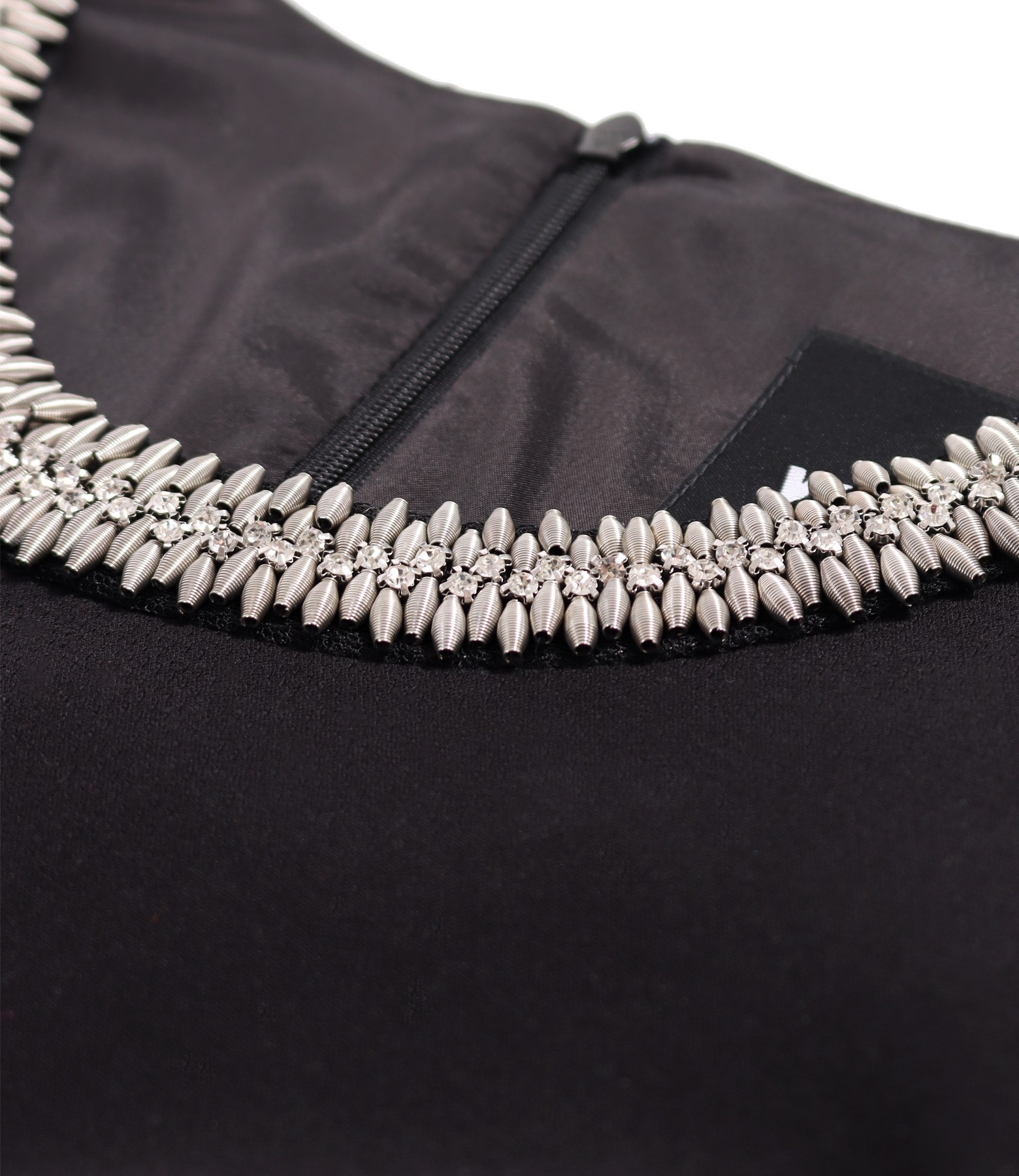 Flared dress with round neckline with decorative trim, made of elastic fabric with viscose, lined, with 3/4 sleeves. Closes with a hidden zipper in the middle of the back.