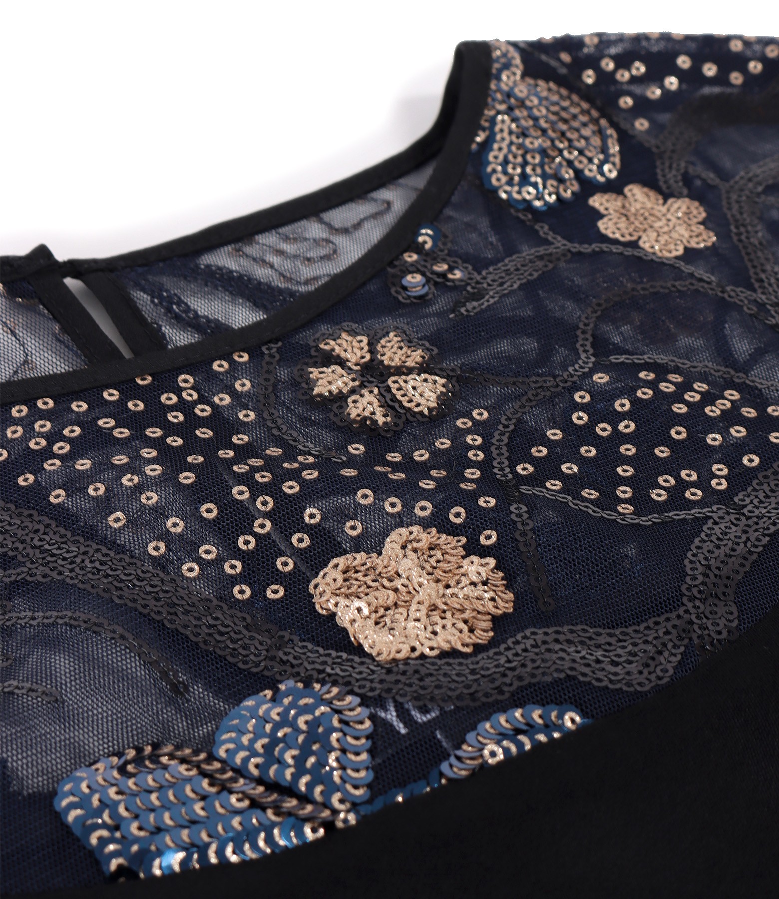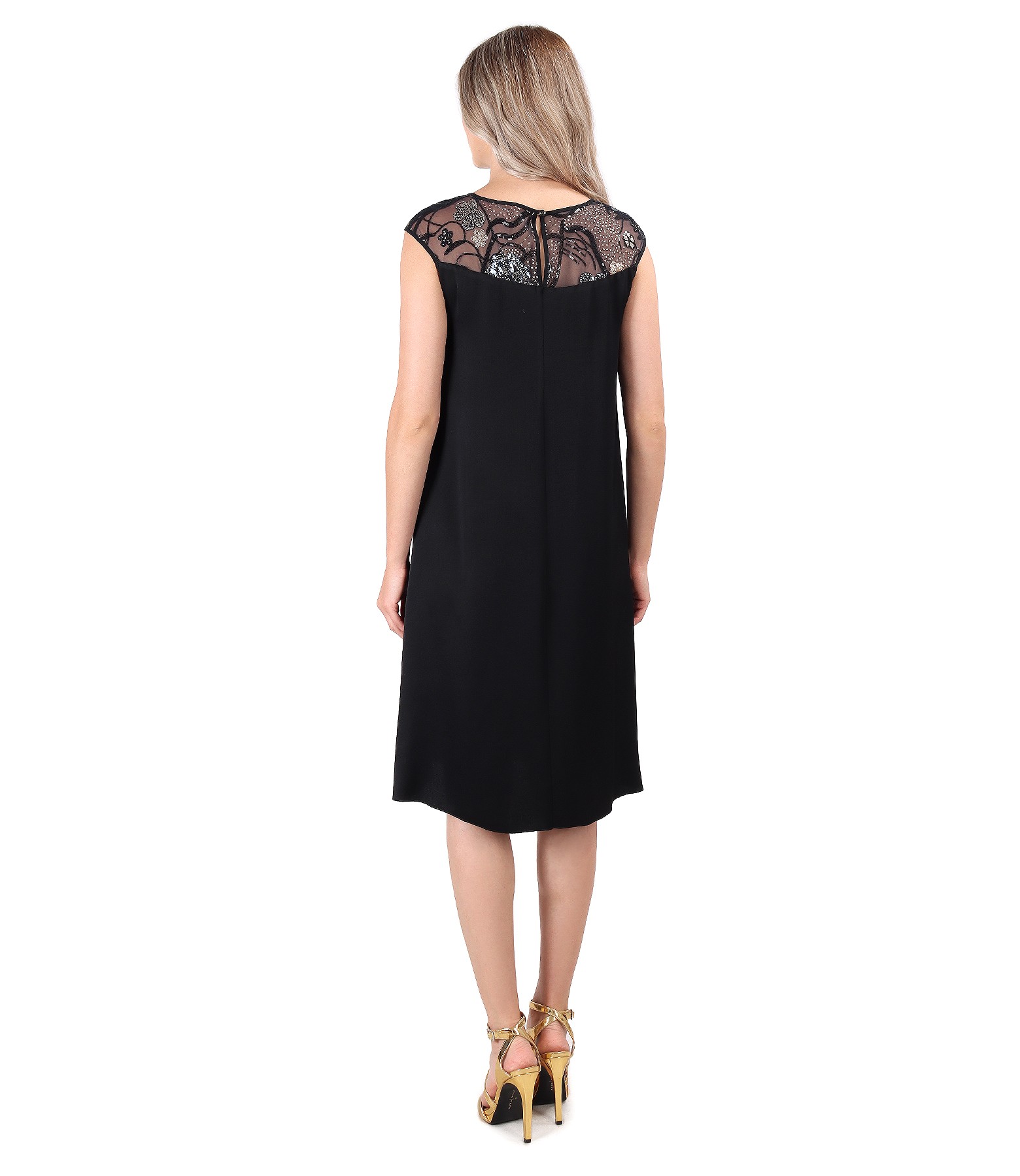 Flared veil dress, padded with satin, with a lace front with sequins. It closes with a button on the middle back. Embroidery varies by product.