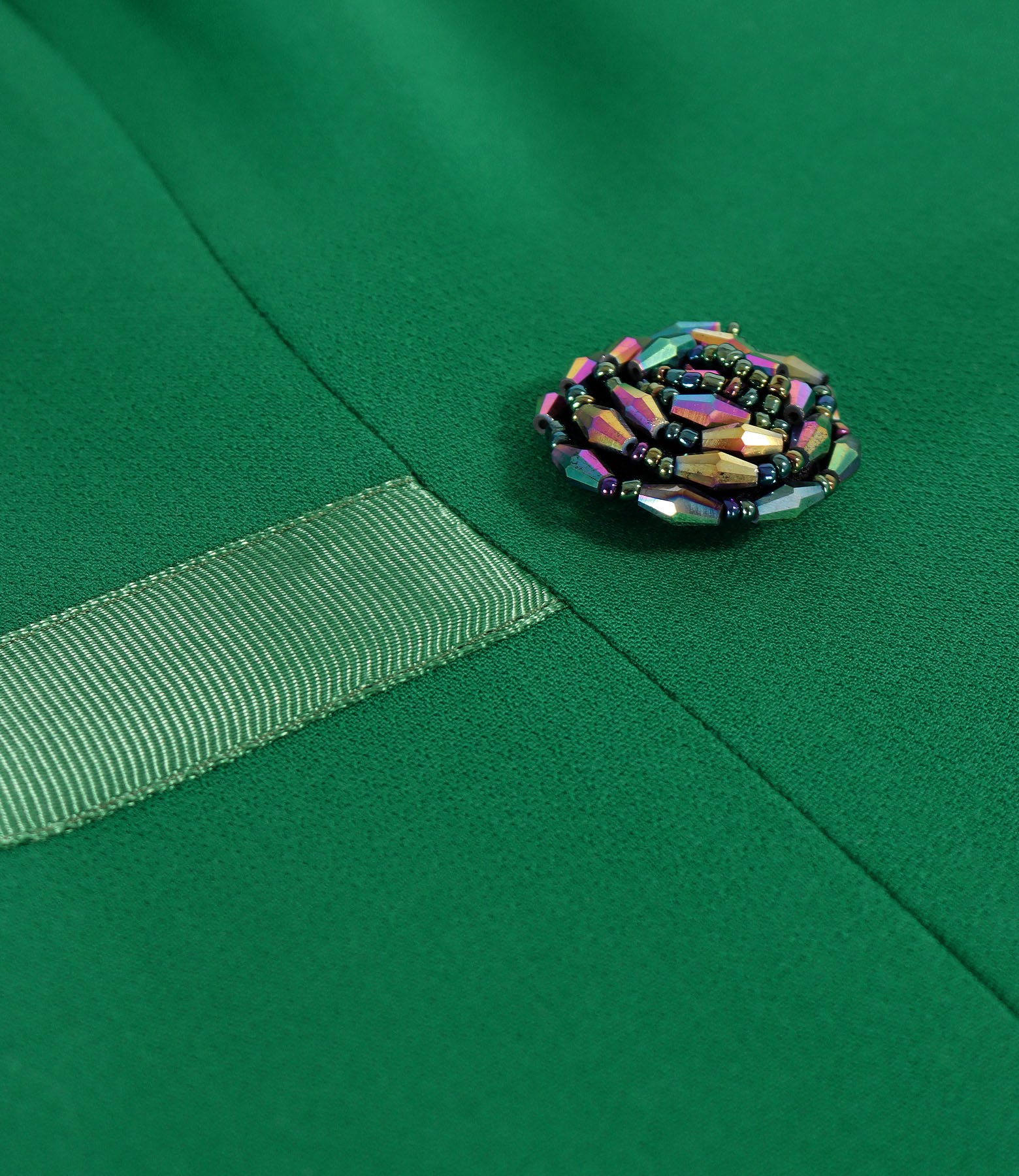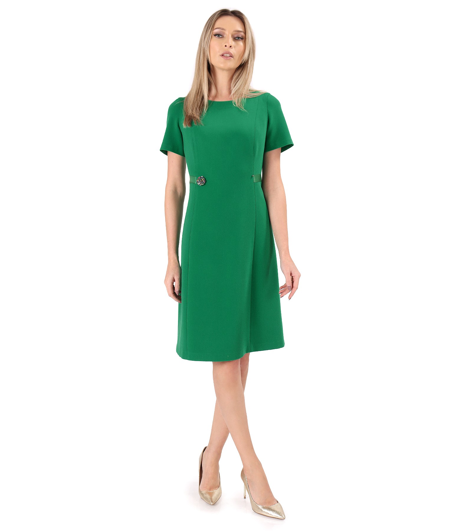 Flared office dress made of elastic fabric with viscose, padded, with short sleeves, round neckline, and decorative ornament at the waist. It closes with a hidden zipper in the middle of the back.