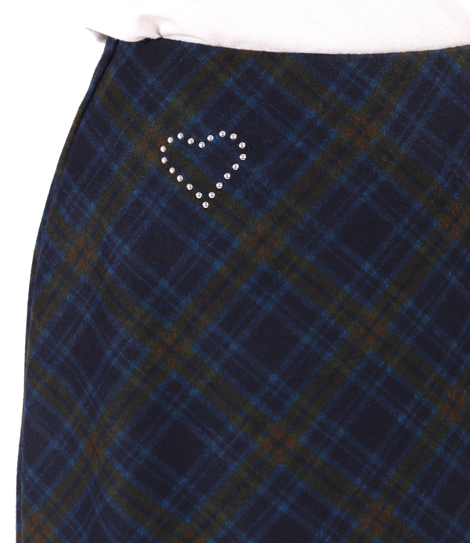 Flared midi skirt made of thick elastic checkered fabric, padded and with a decorative heart at the waist. Closes with a hidden zipper on the left side.