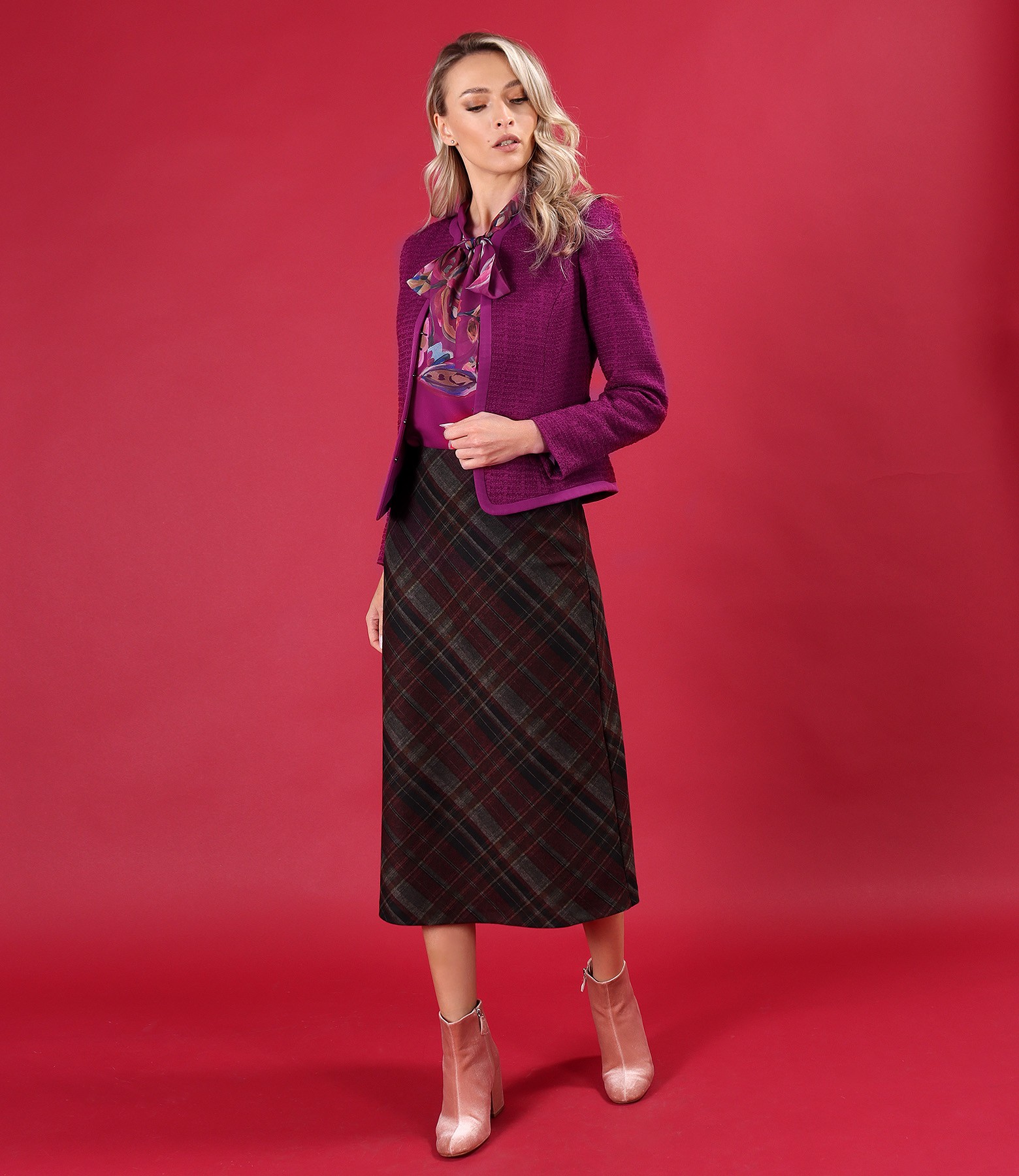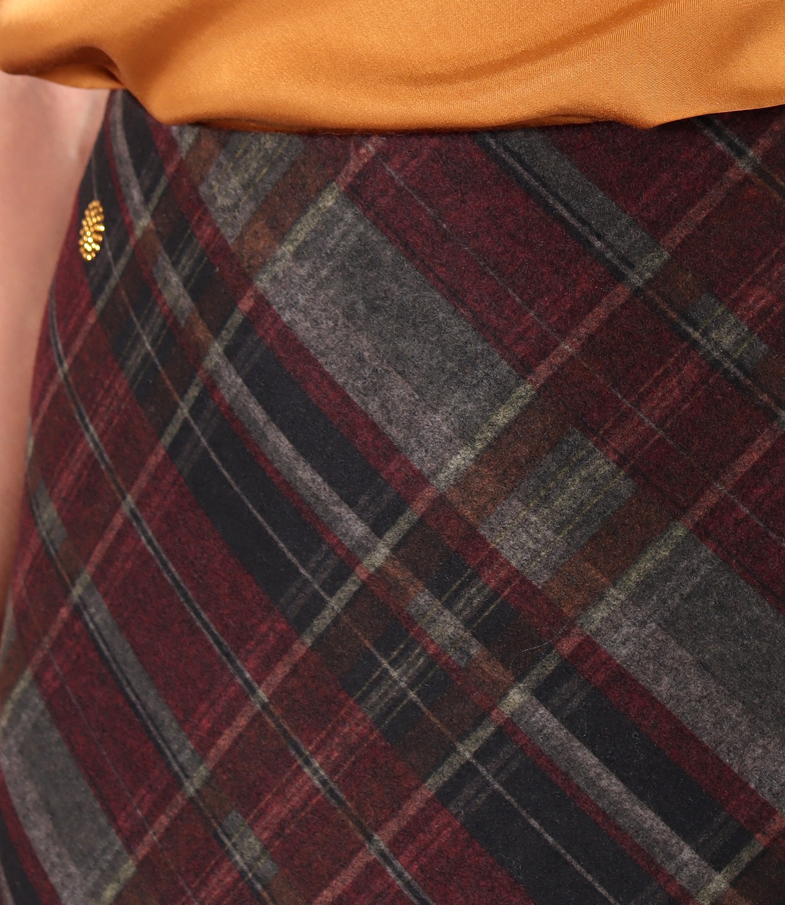 Flared midi skirt in thick checkered elastic fabric, padded and with decorative appliqué at the waist. It closes with a hidden zipper on the left side.