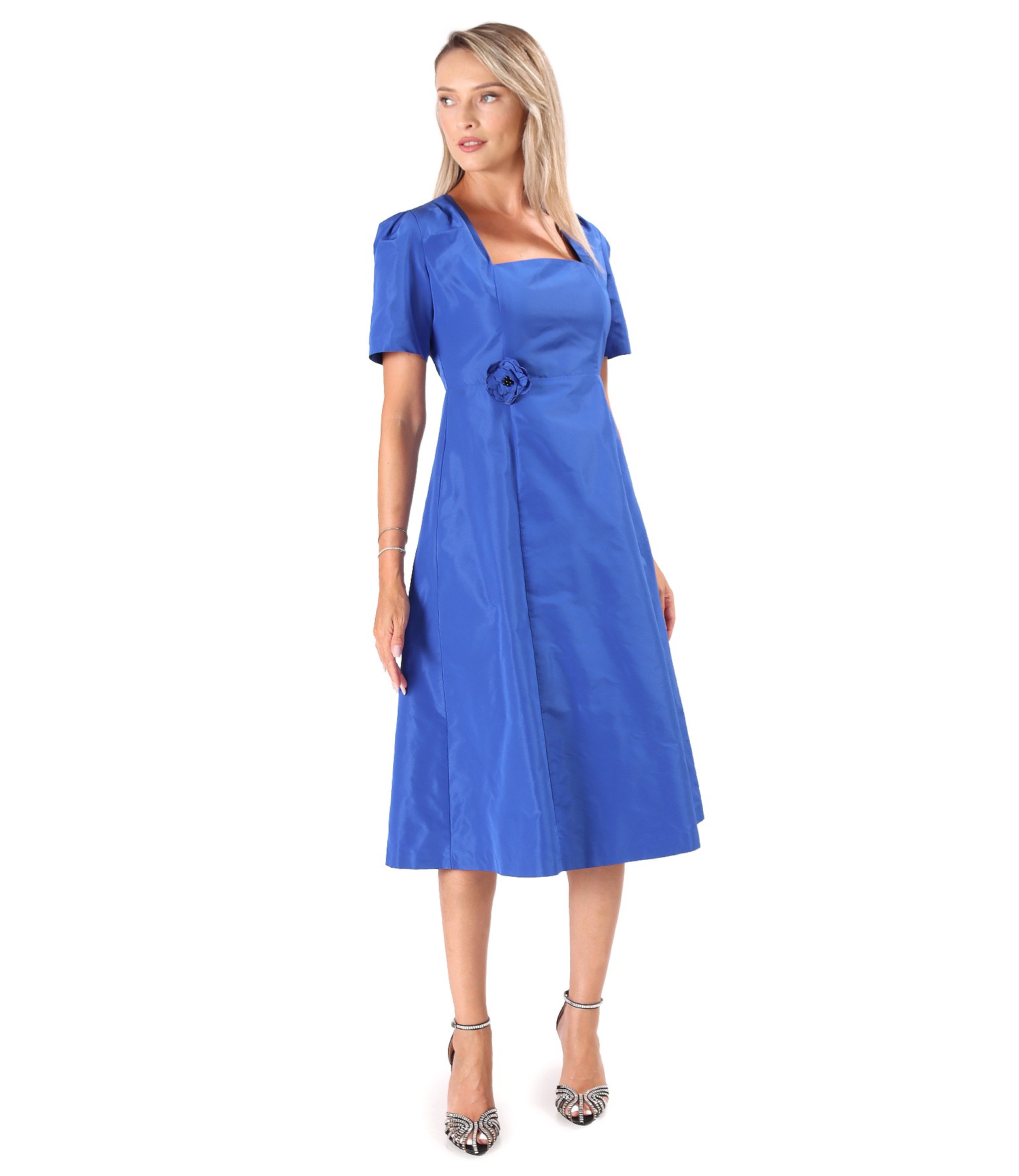 Flared taffeta dress with flower at the waist (Riyal blue), size