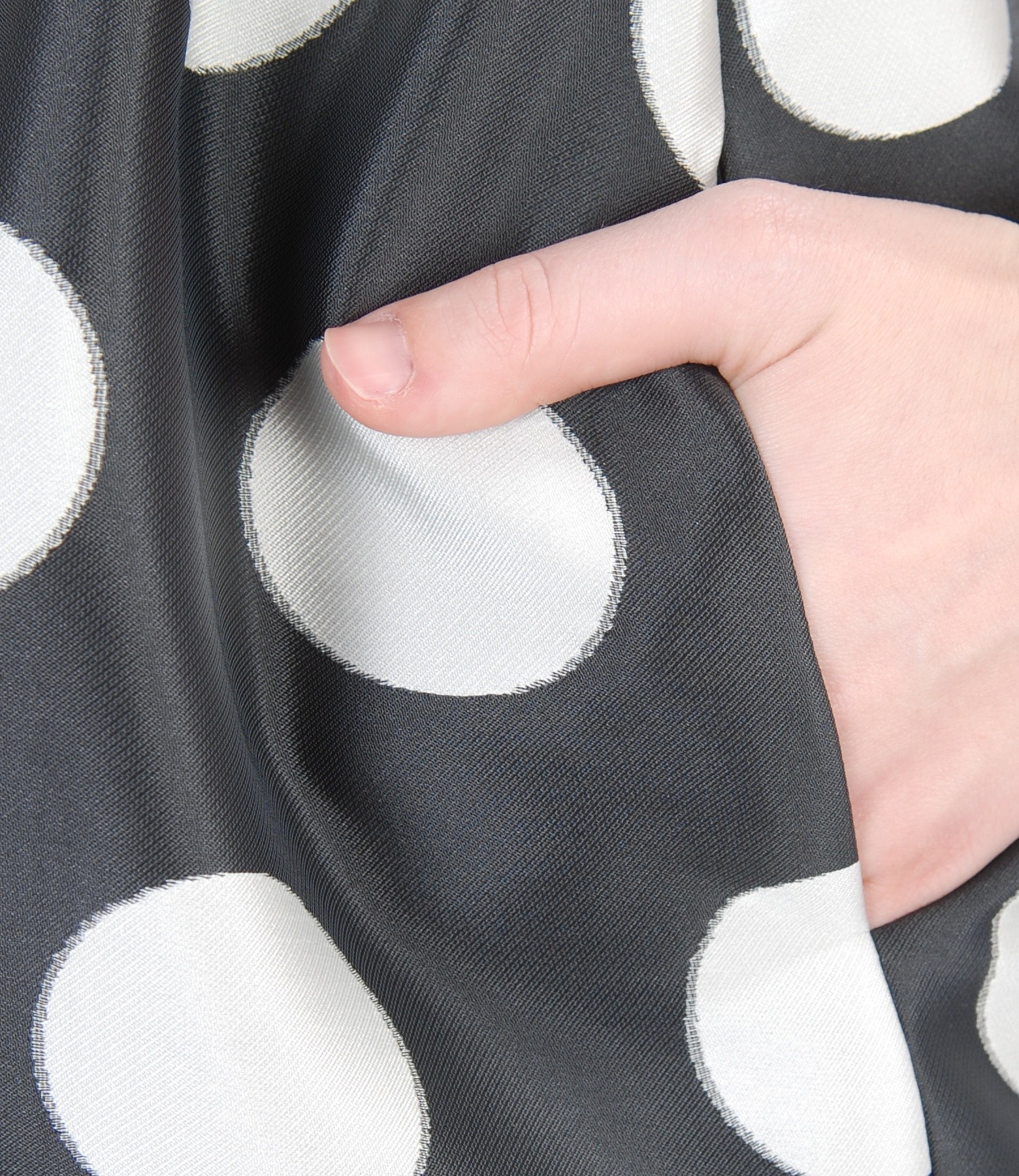 Flaring dress with dots print, exclusive design, waist cut, with hidden side pockets. Tightens with a removable belt with a staple. Closes with hidden zipper on the middle back.