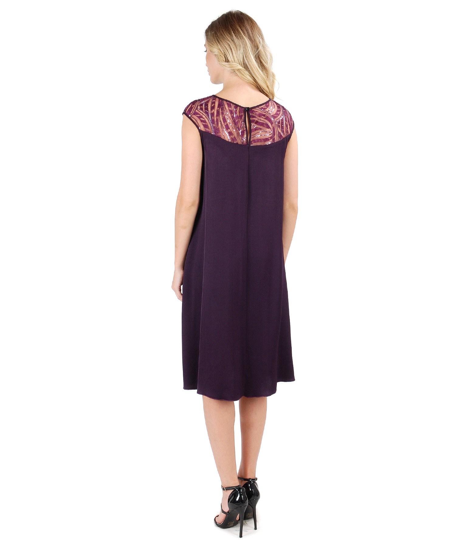 Flaring dress, casual, unlined, lace trim with sequins. Closes with a middle back button.