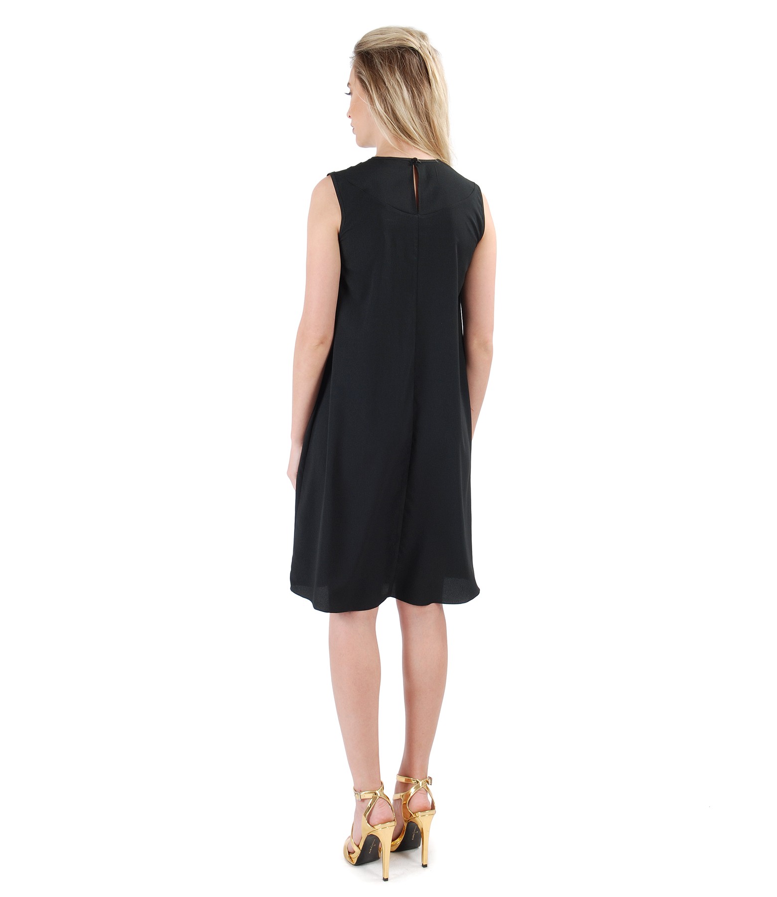 Flaring dress, casual, with satin flowers and sparkles. Closes with a button on the middle back.