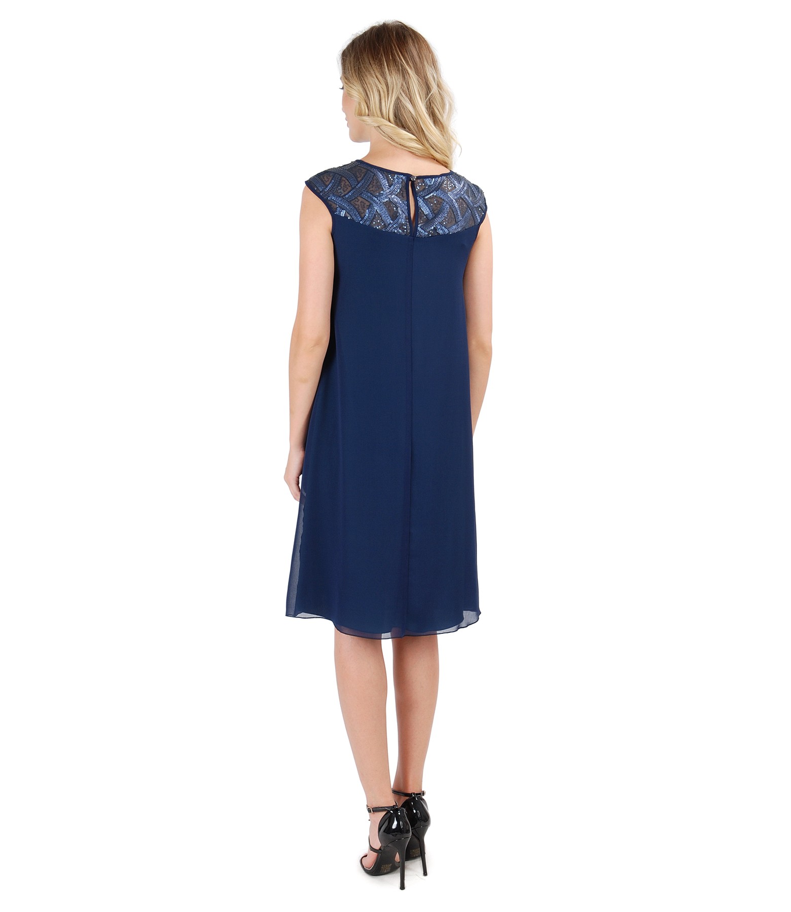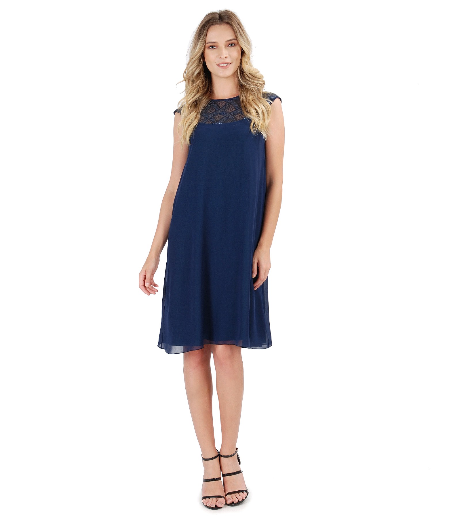 Flaring dress, casual, lace trim with sequins. Closes with a middle back button.
