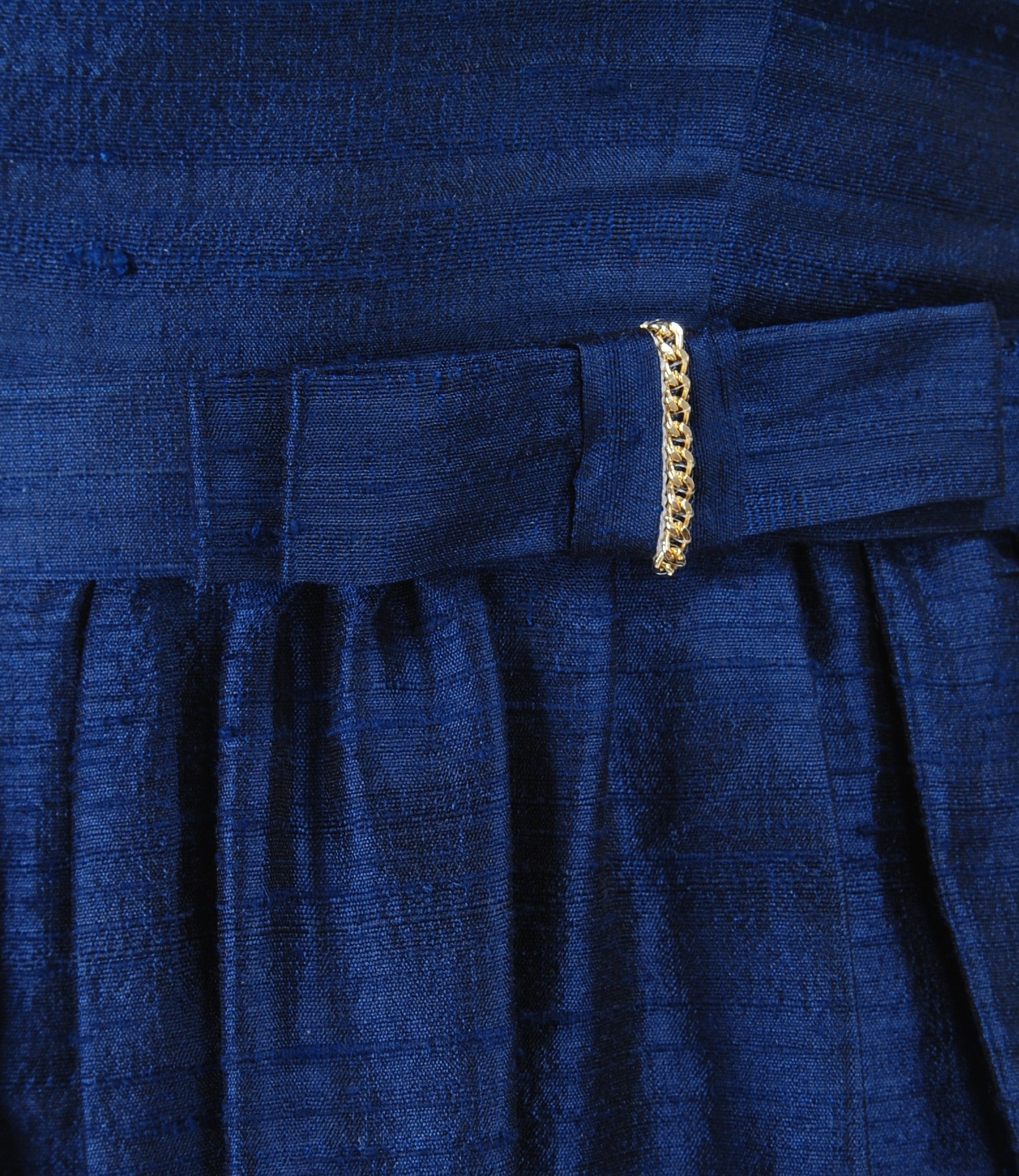 Short evening dress from silk taffeta, without sleeves, cut in waist. Tightens in waist with a detachable cord with a hook. Middle-back concealed zip fastening.