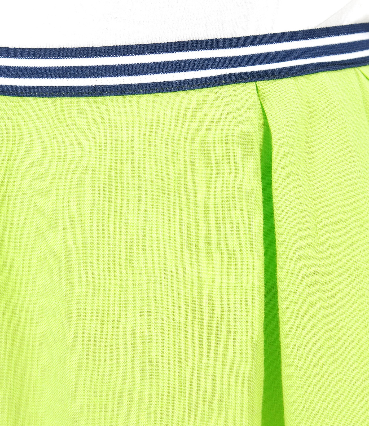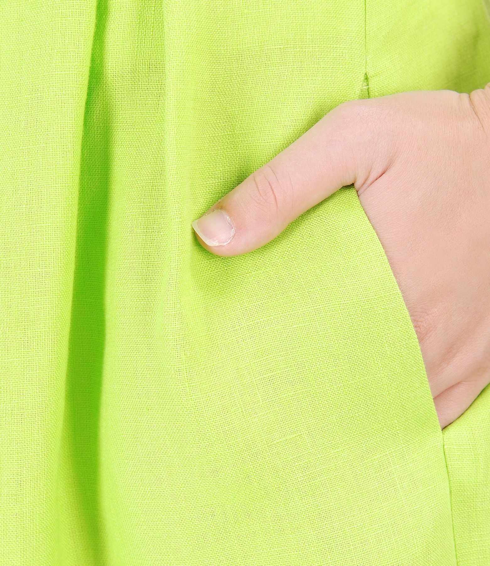 Flax flaring skirt, with front and back folds, vertical side pockets and elastic waist belt. Closes with hidden zipper on the middle back.