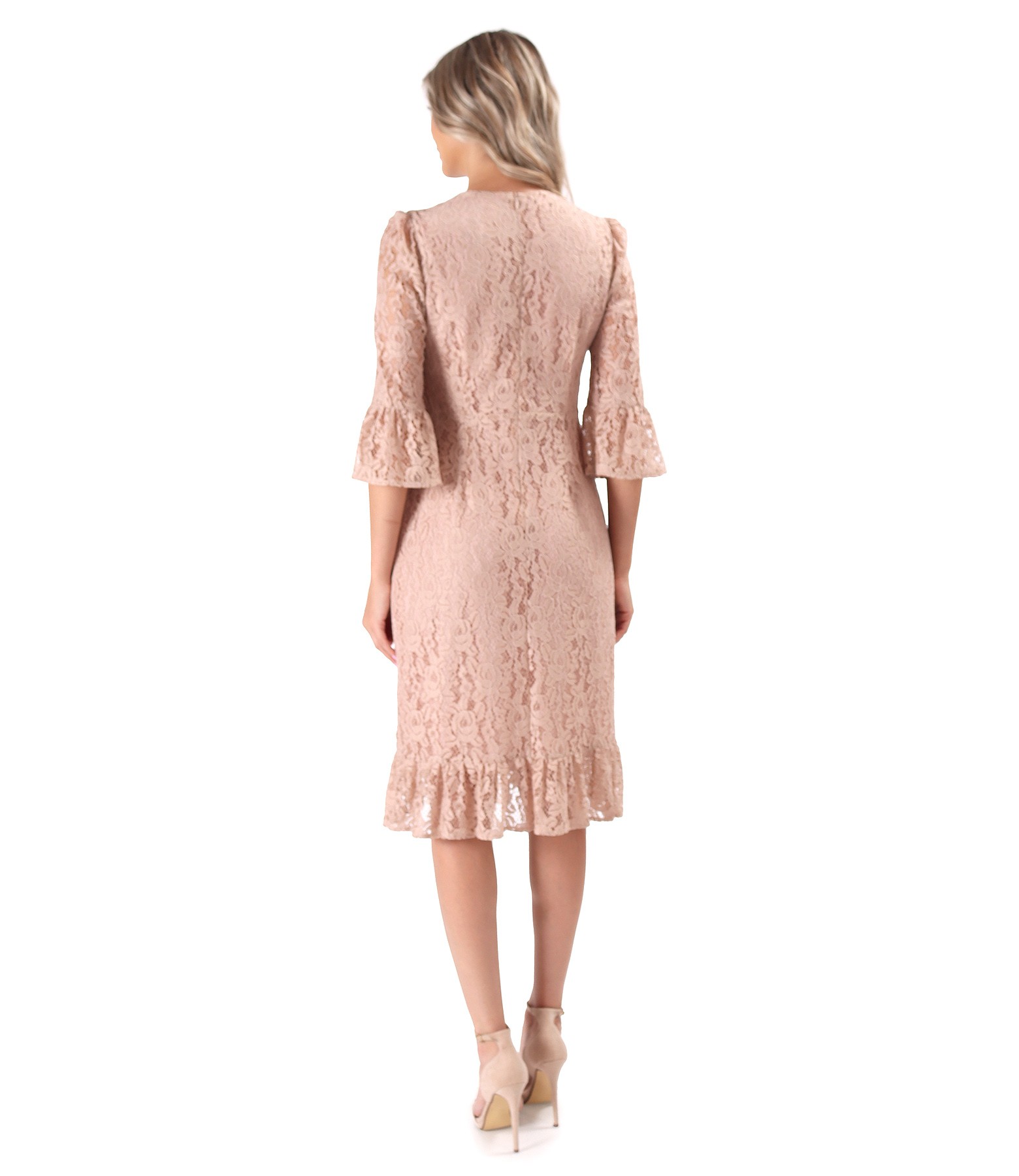 Dress in full lace with floral motifs, lined with viscose, featuring a ruffled hem and 3/4 sleeves. It fastens with a concealed zipper at the center back.