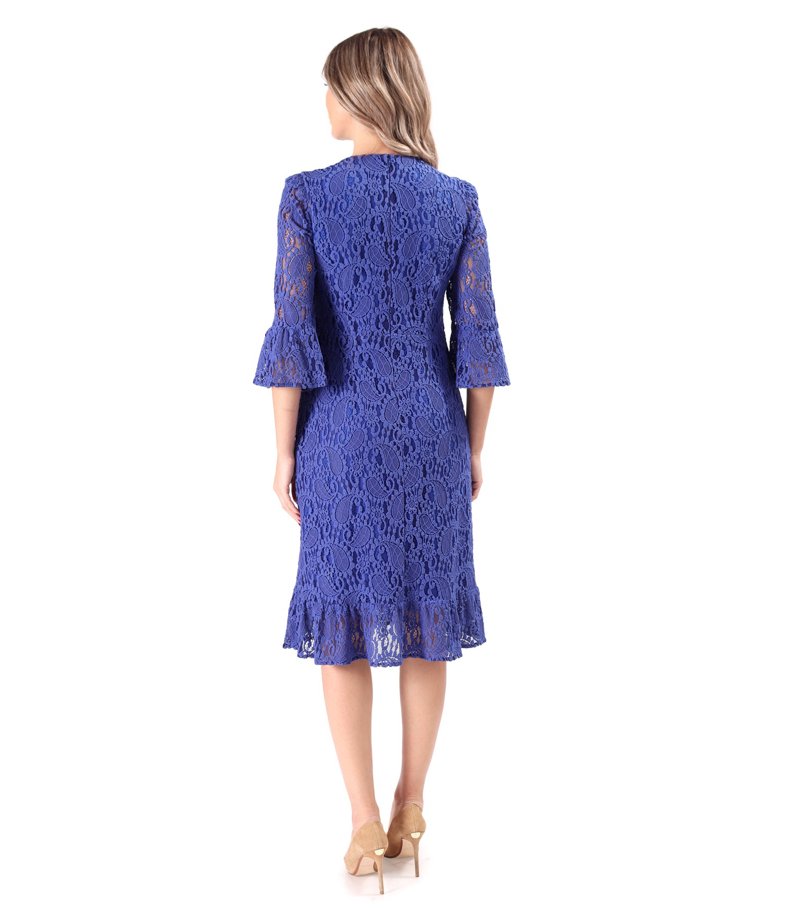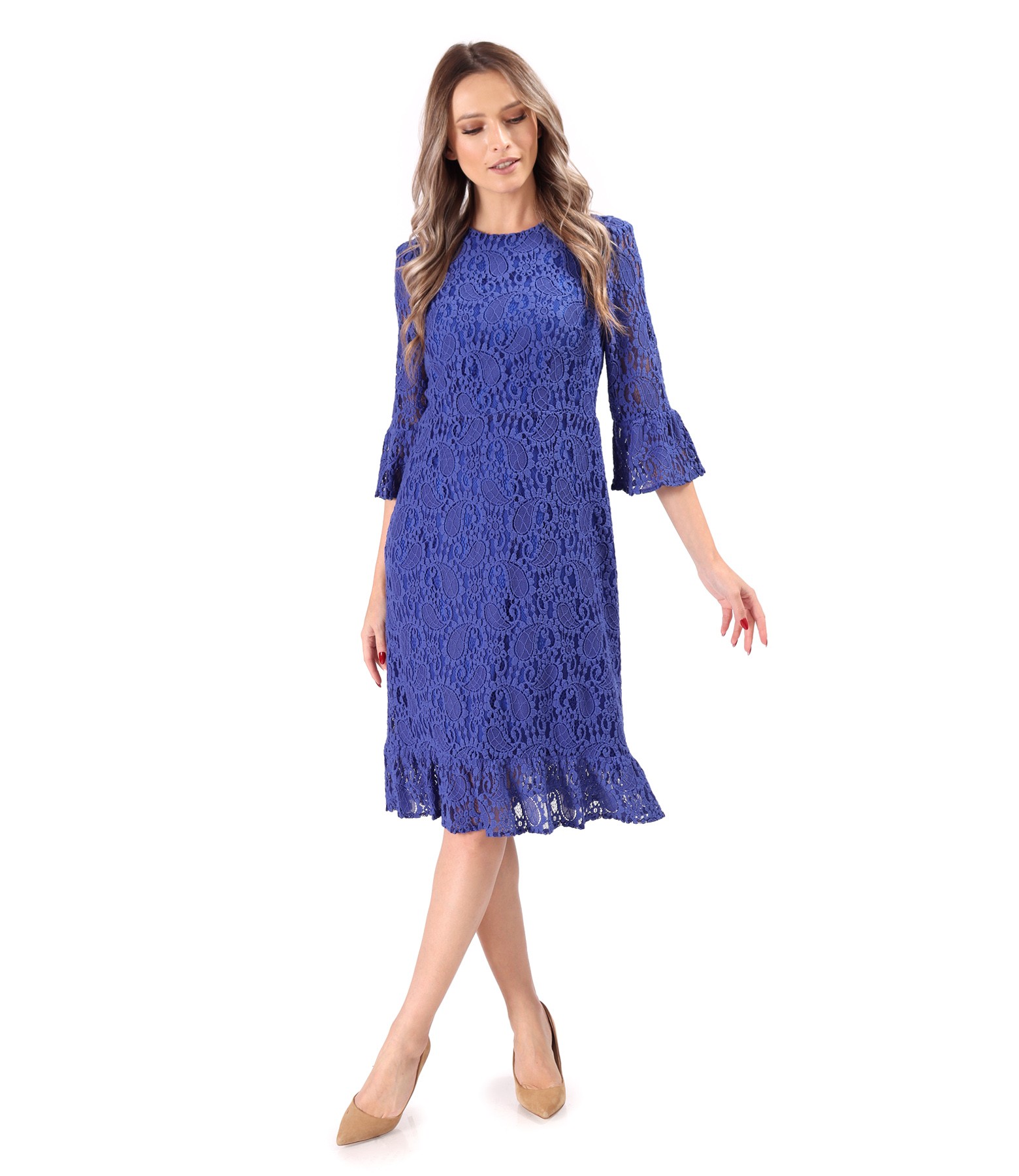 Dress in full lace with floral motifs, lined with viscose, featuring a ruffled hem and 3/4 sleeves. It fastens with a concealed zipper at the center back.