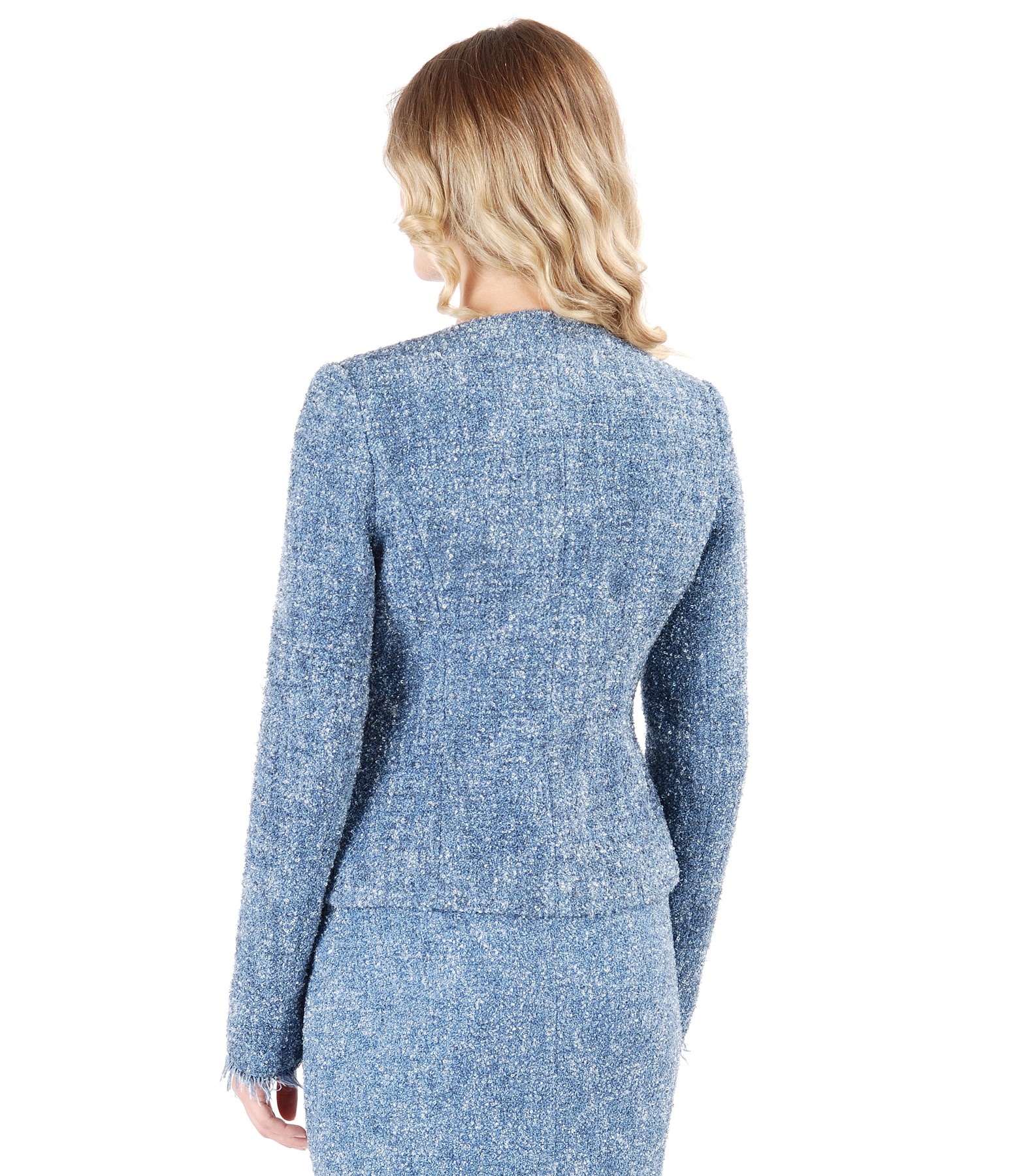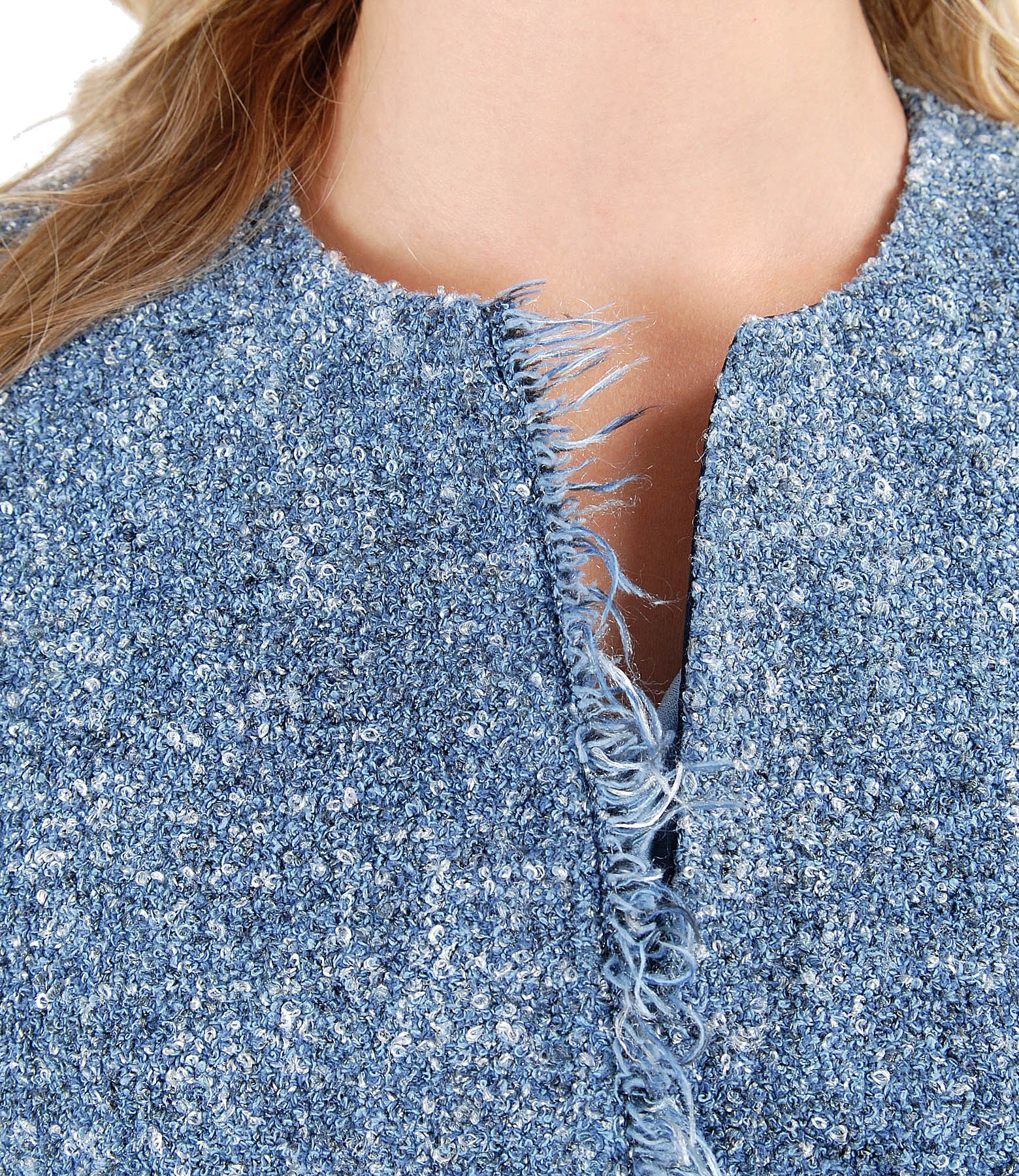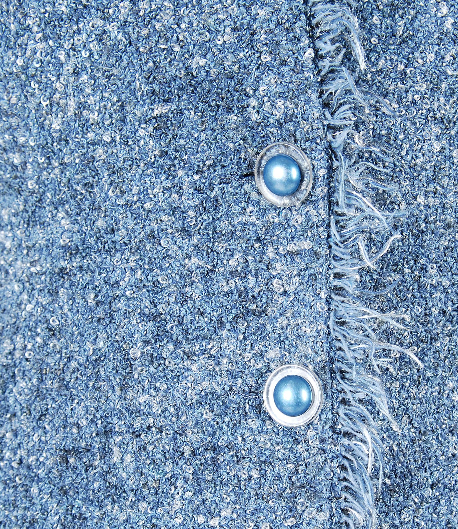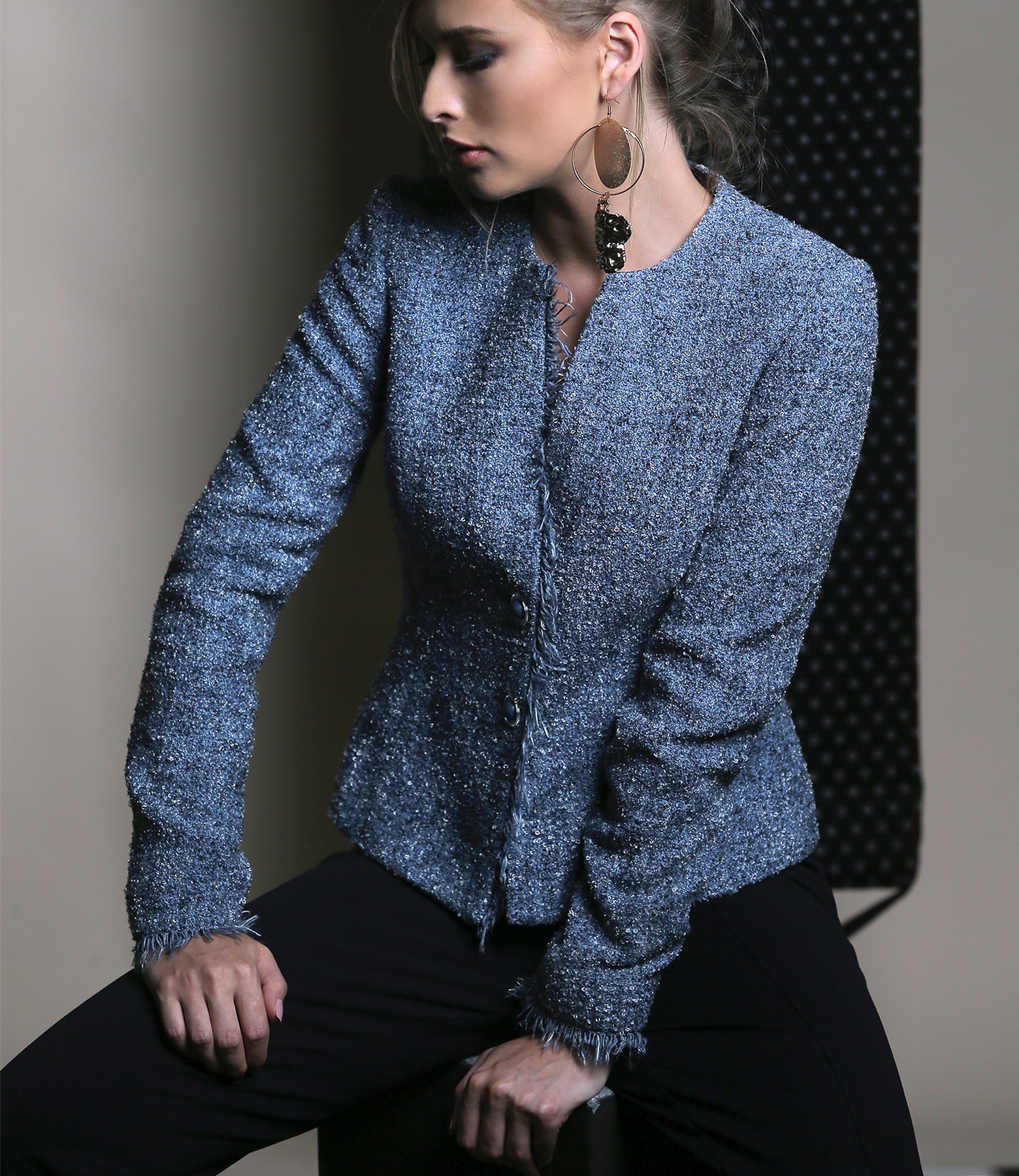 Fringe loop jacket, with decolletage near neckline. Closes with 2 front buttons.