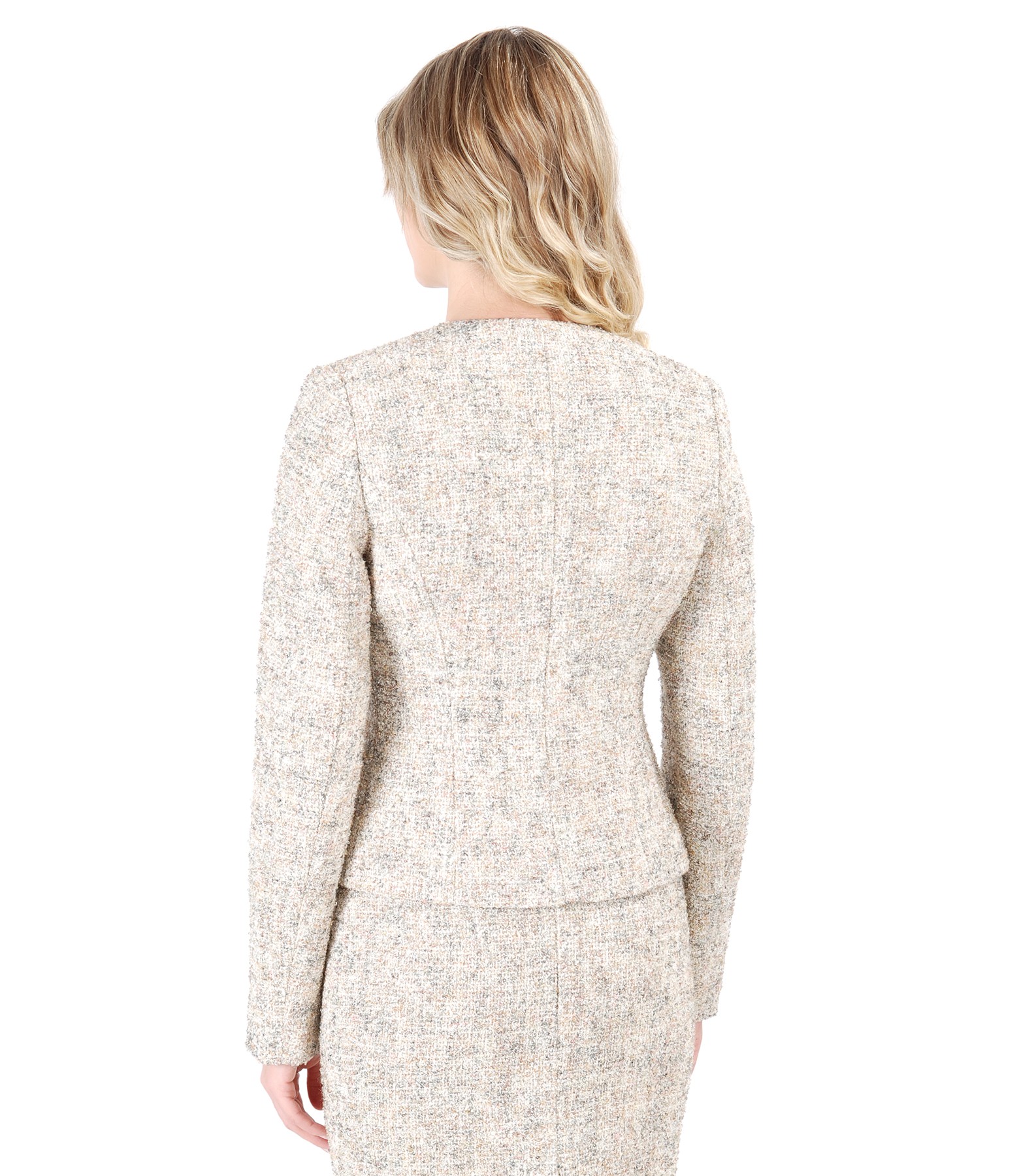Fringe loop jacket, with decolletage near neckline. Closes with 2 front buttons.