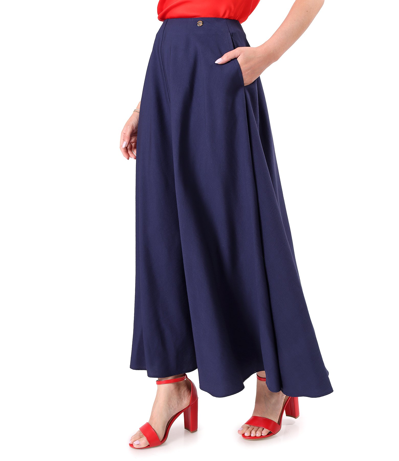 Fusta lunga din viscoza usor creponata, cu buzunare laterale. Se inchide cu fermoar ascuns pe mijloc spate.