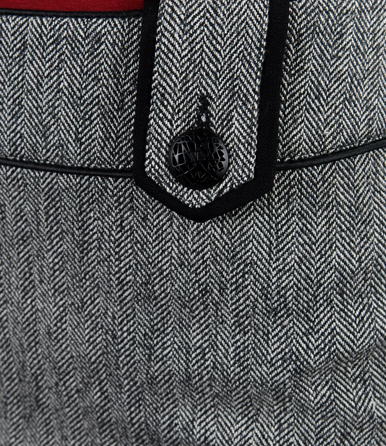 Office skirt from tweed, with waist cord and trim with 2 wide straps in front and back, closed with one button. Middle back concealed zip-fastening