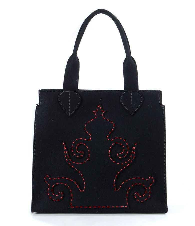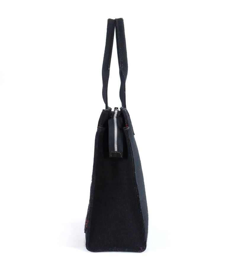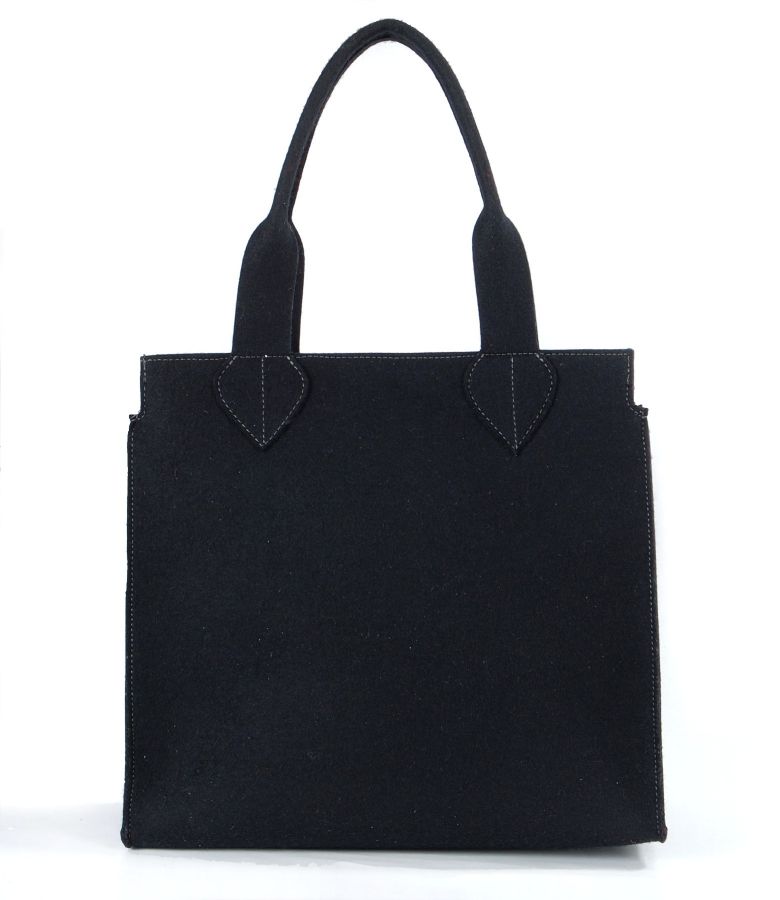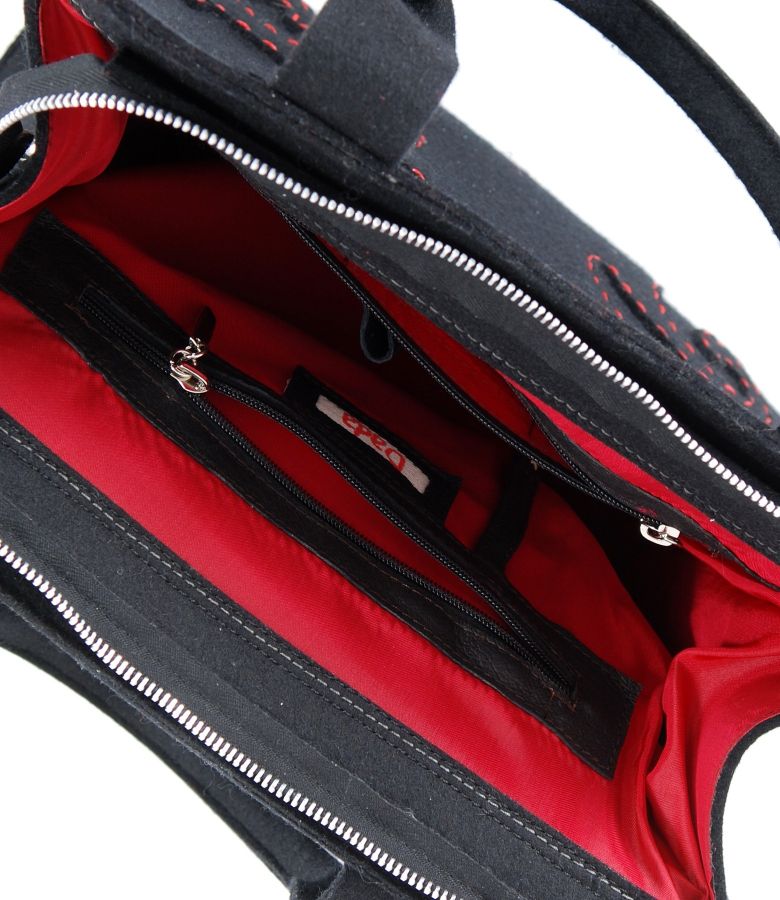 Felt bag, with lining, with application and decorative contrast stitching on front. One main pocket and two side pockets. Closes with metal zipper.