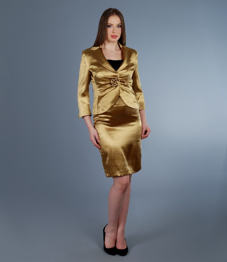 Elastic satin jacket, with V cut neckline, pleats on front and detachable handmade flower. Pencil skirt without cord, with overlapped slit.