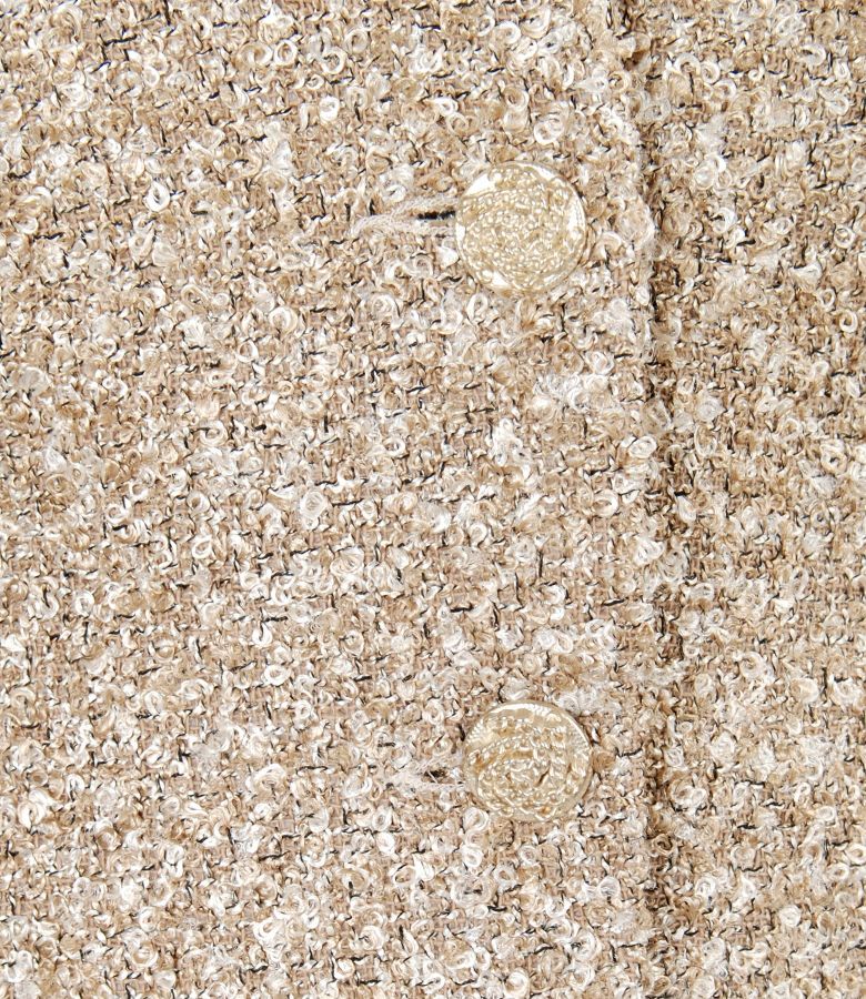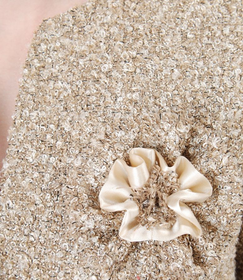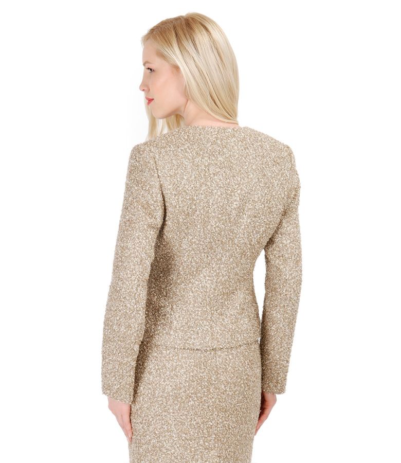 Jacket without collar from loops, golden with cotton, with V neck-cut, side gussets in front and back. Closes with 2 front buttons
