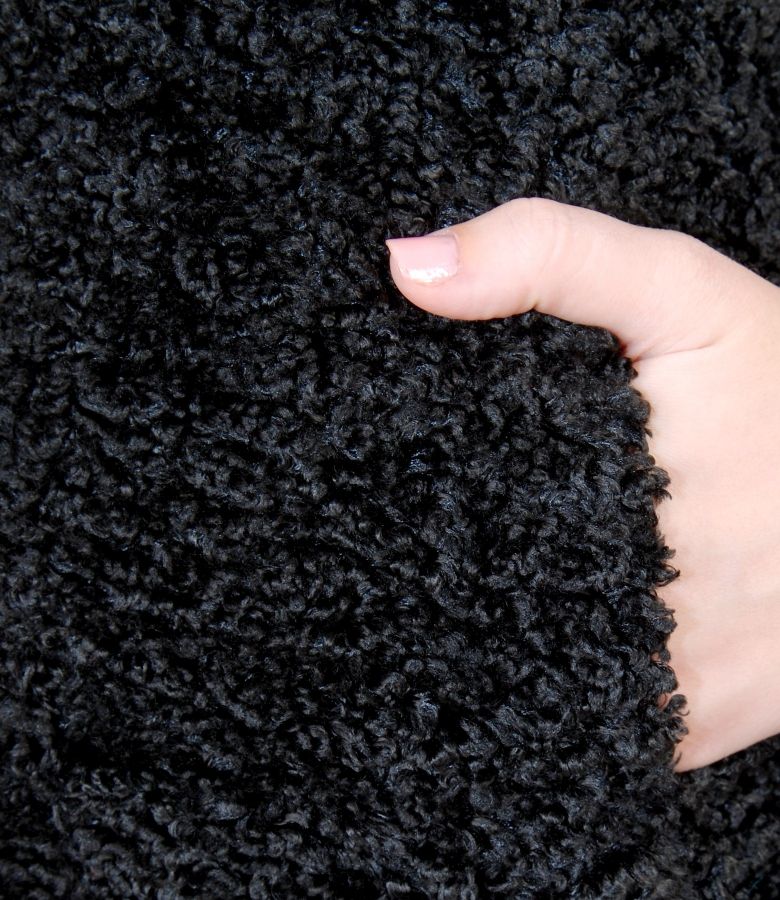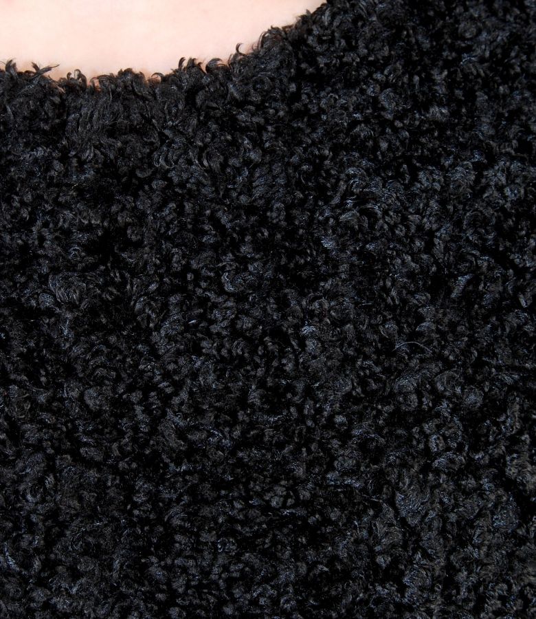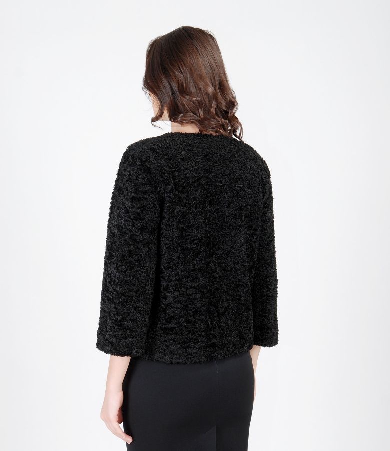 Jacket from looped fabric, without collar and lapels, with hiden side pockets. Closes on front with 5 hooks.