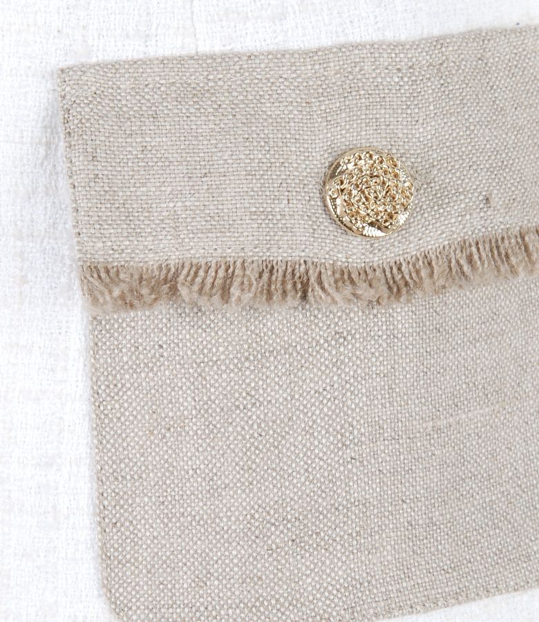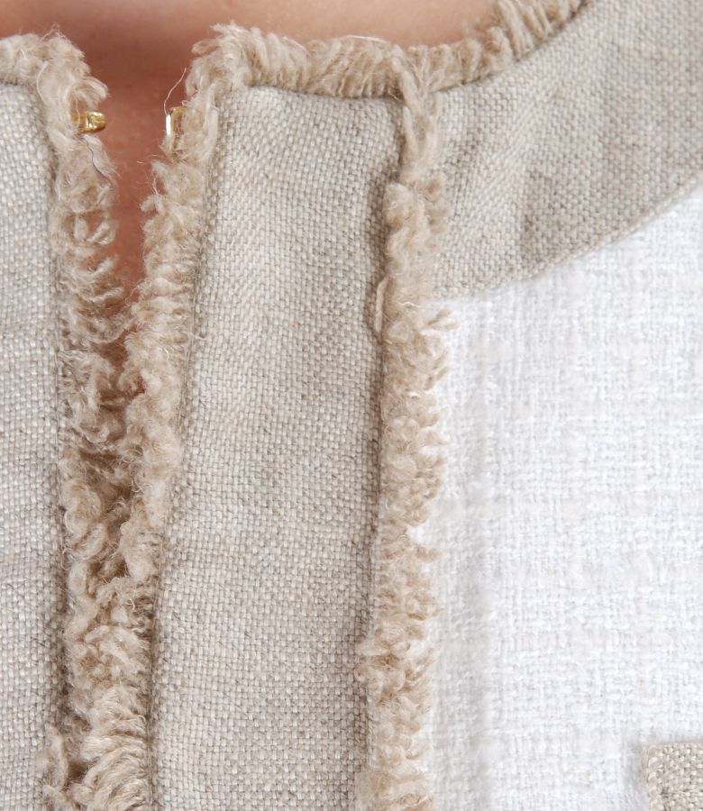 Cotton boucle jacket with virgin wool, without collar and lapels, with two side pockets closed with flap and button and two flaps on chest, closed with button. Epaulettes, trim on edge, sleeves and linen flaps with unfinished look. Closes with 5 hooks on front.
