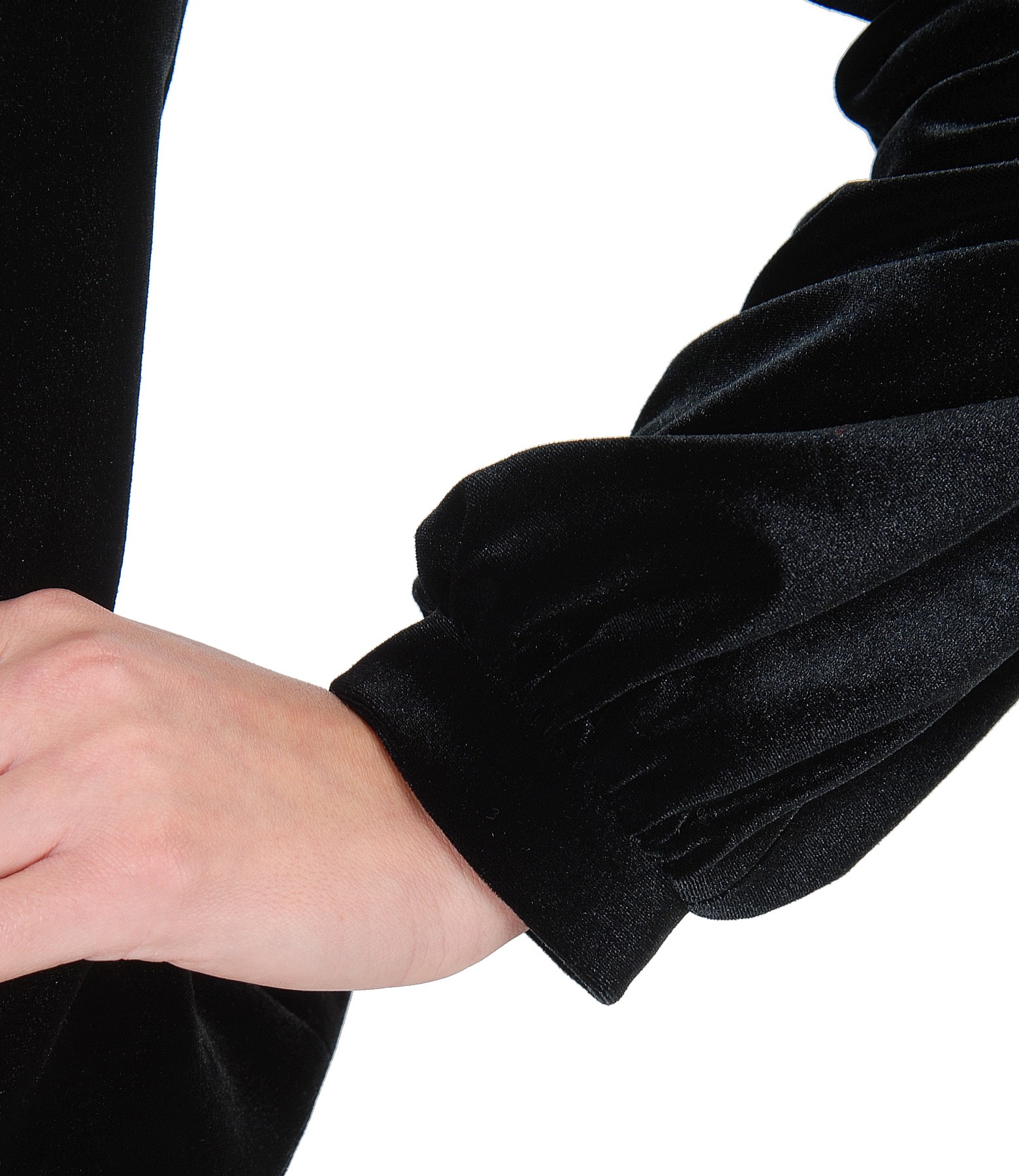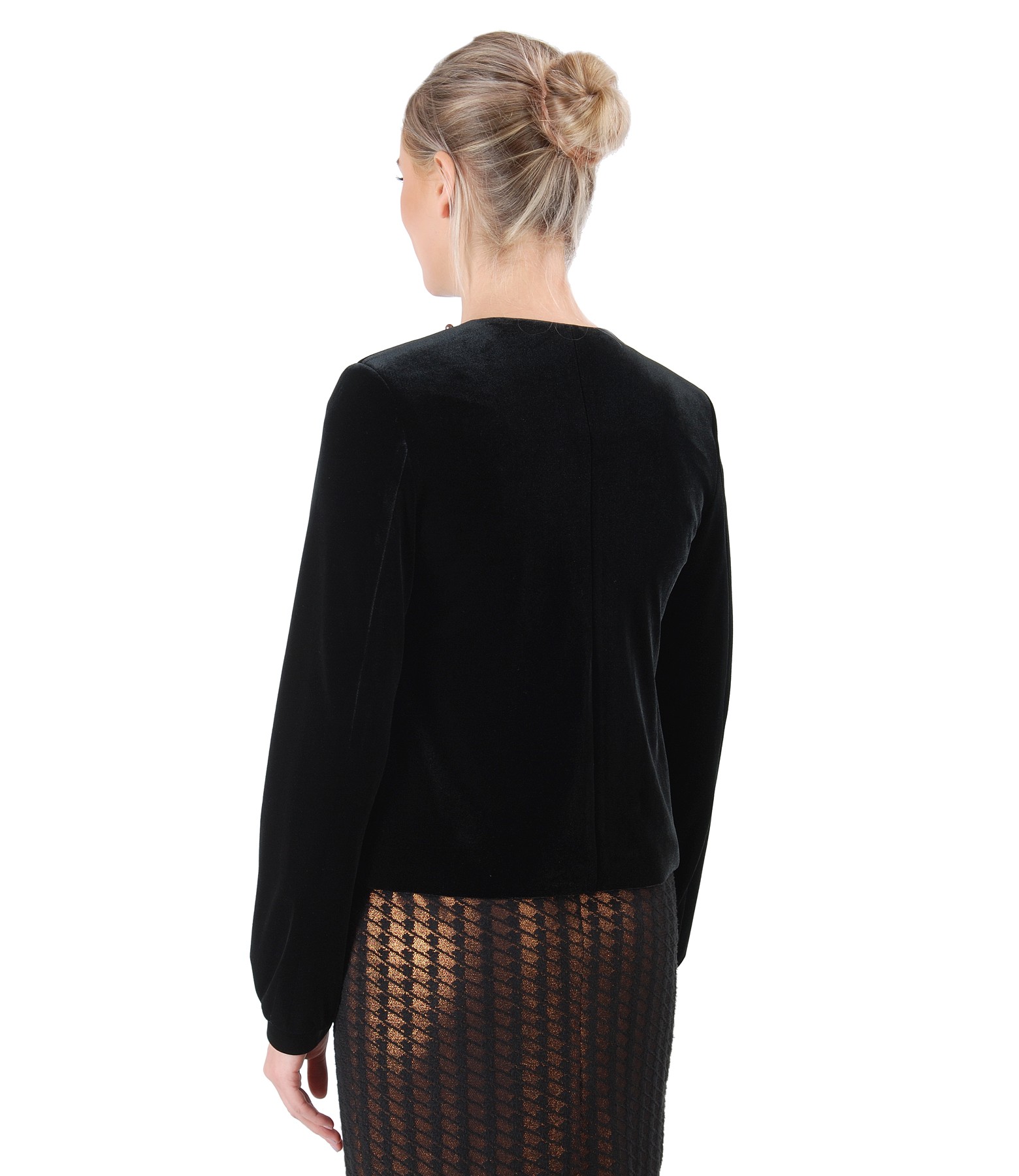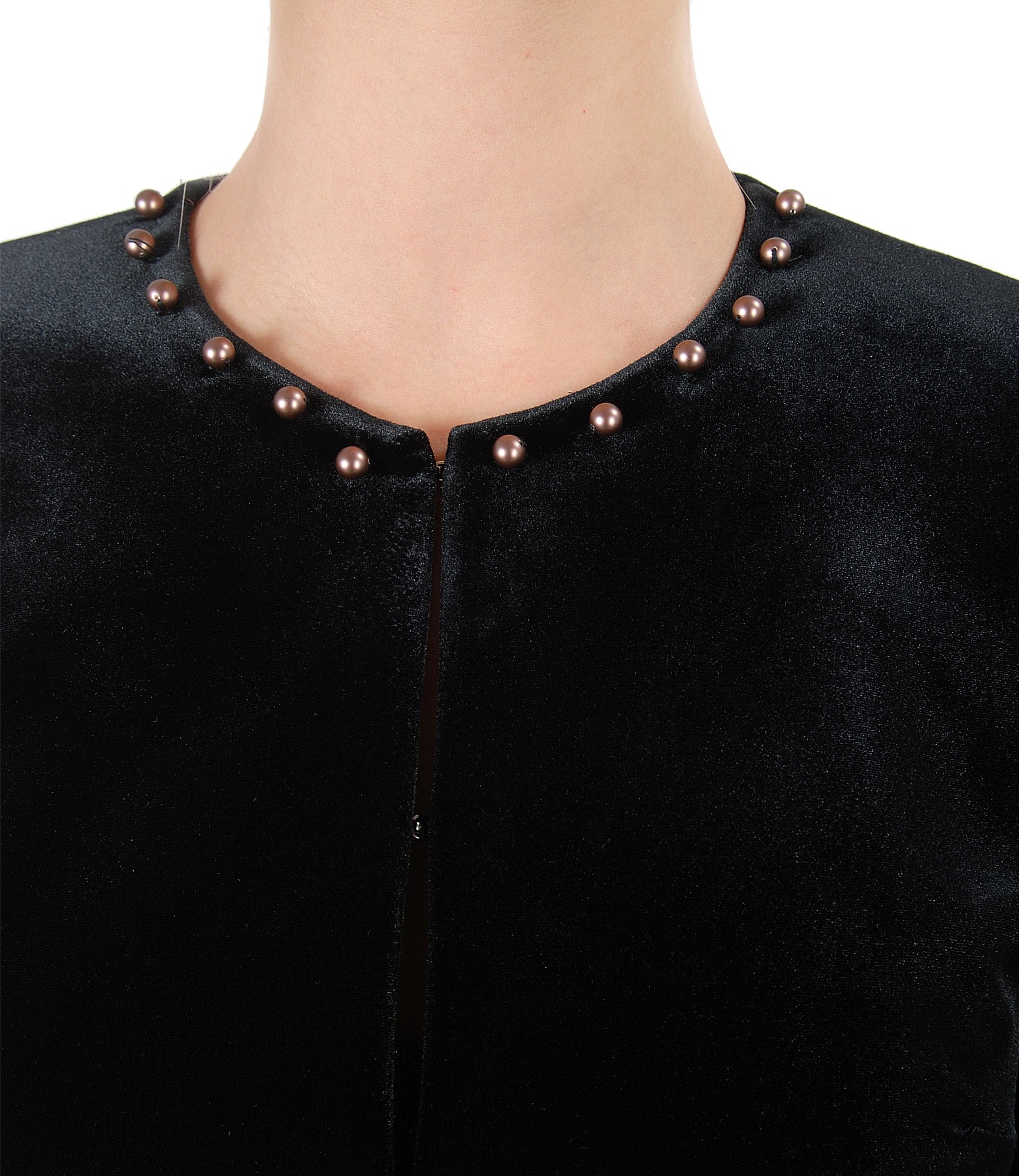 Elegant jacket made of black elastic velvet, without collar, with long sleeves and 12® beads on the low-cut neck. Closes with 5 front staples.
