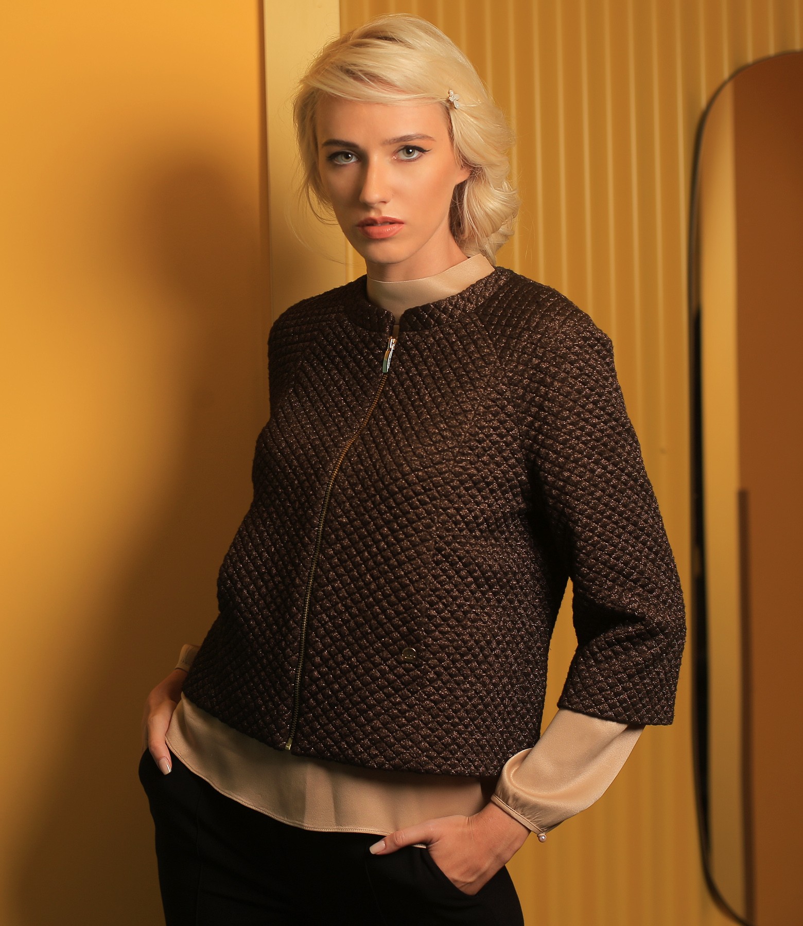 Bolero made of elastic brocade with geometric motifs and thread of copper effect, lined, with tunic collar, 3/4 sleeves and hidden vertical pockets. It closes with a metal zipper on the face.
