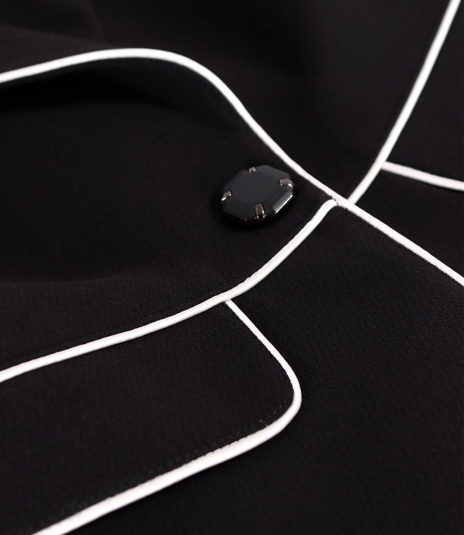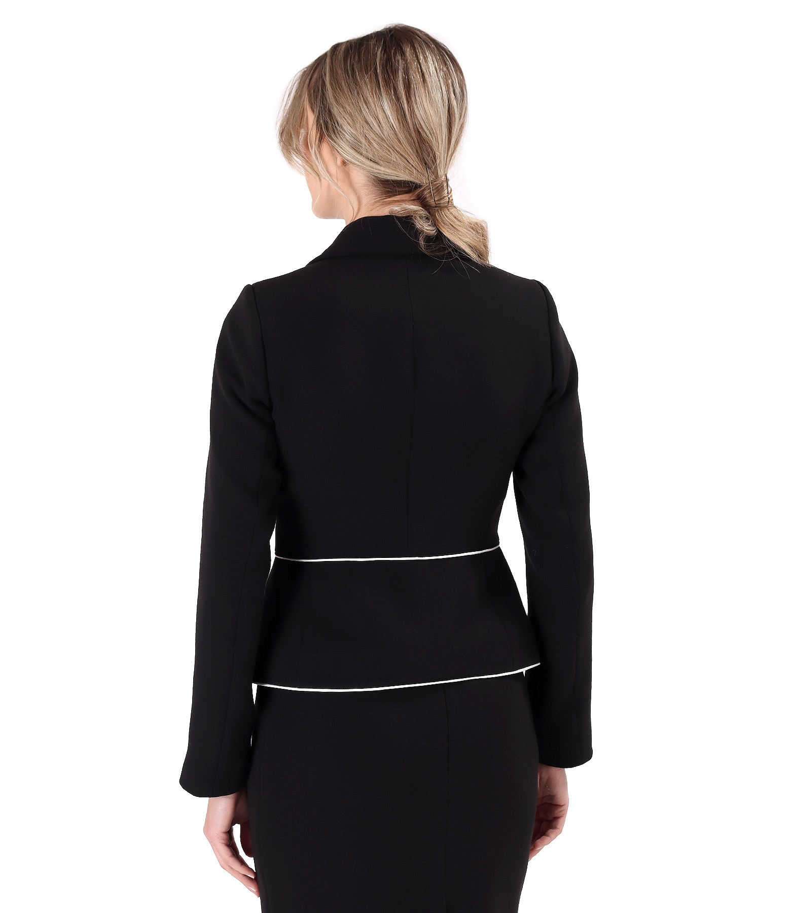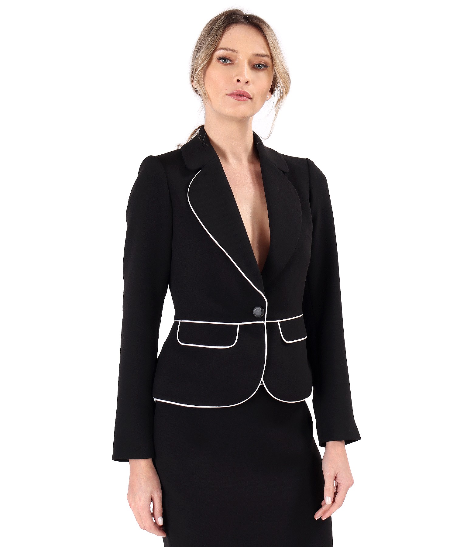 Jacket made of elastic fabric with viscose, with a rounded collar and lapels, with two flaps at the waist and contrasting trim. It closes with a button on the front.