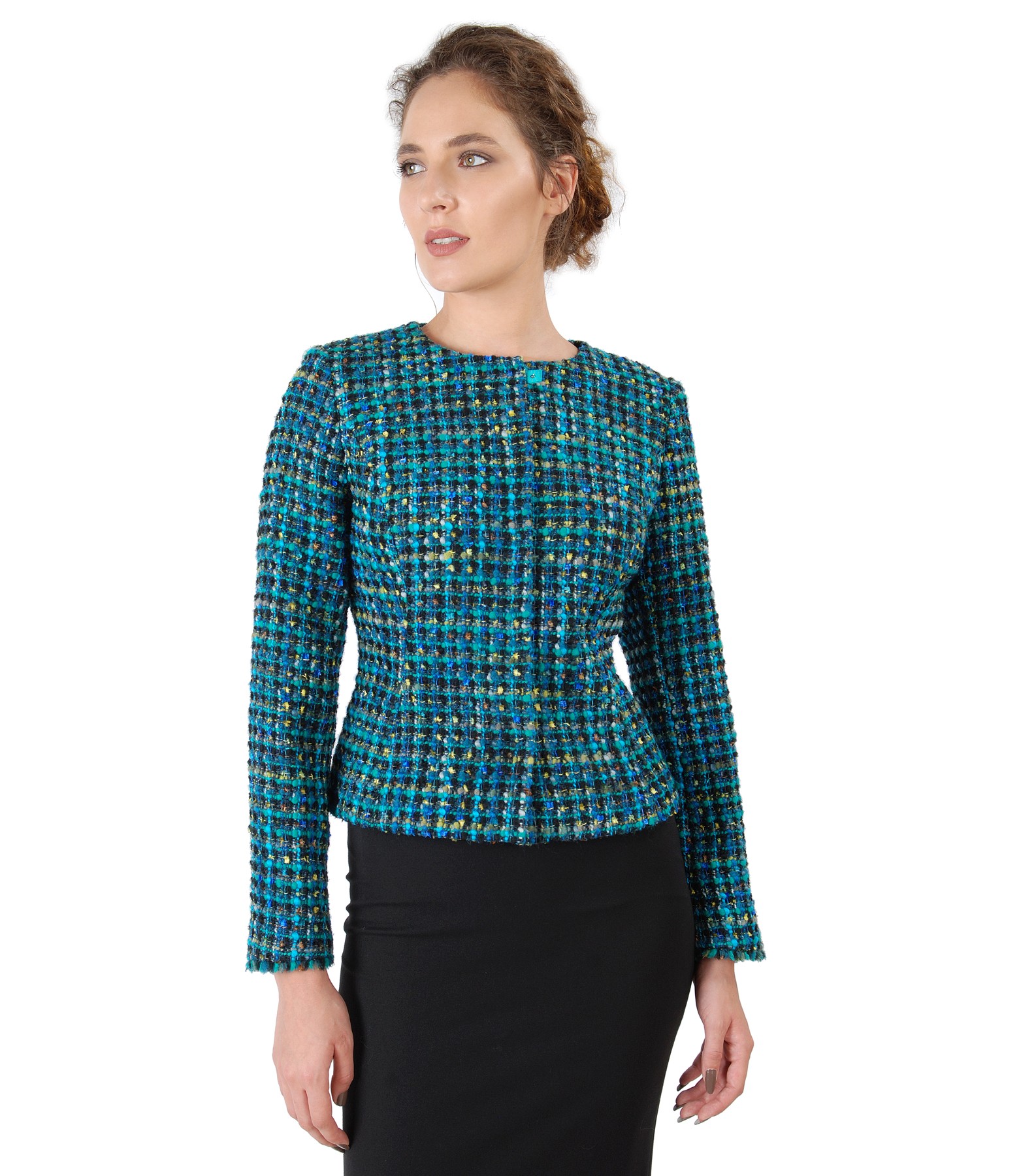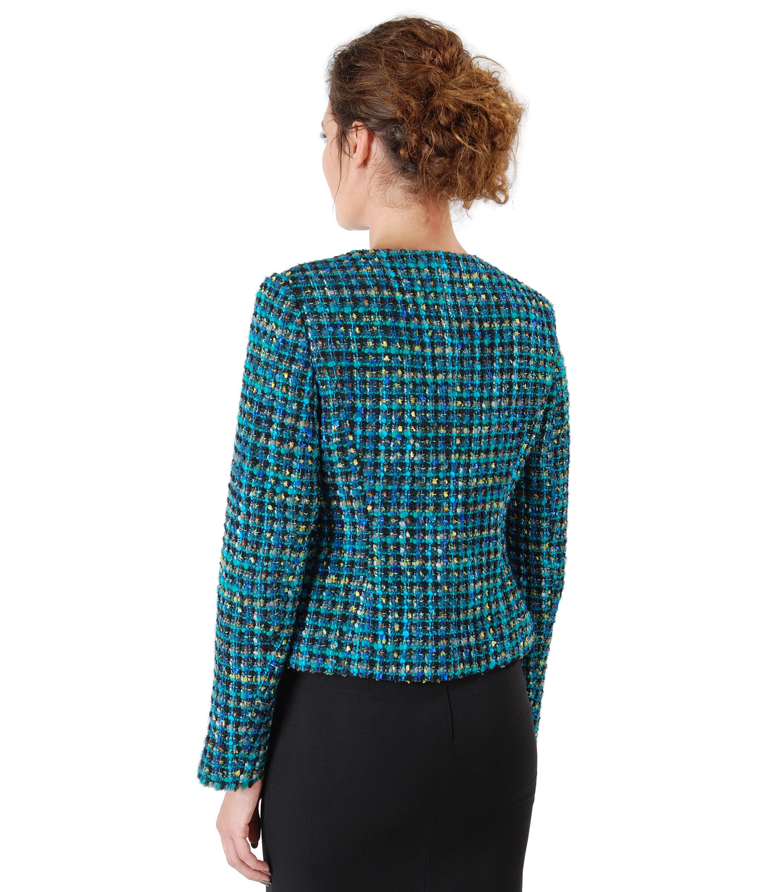 Jacket made of multicolor loops, without collar, embellished with crystals on the low-cut neck and fringes at the sleeve edge. Closes with 5 front staples.