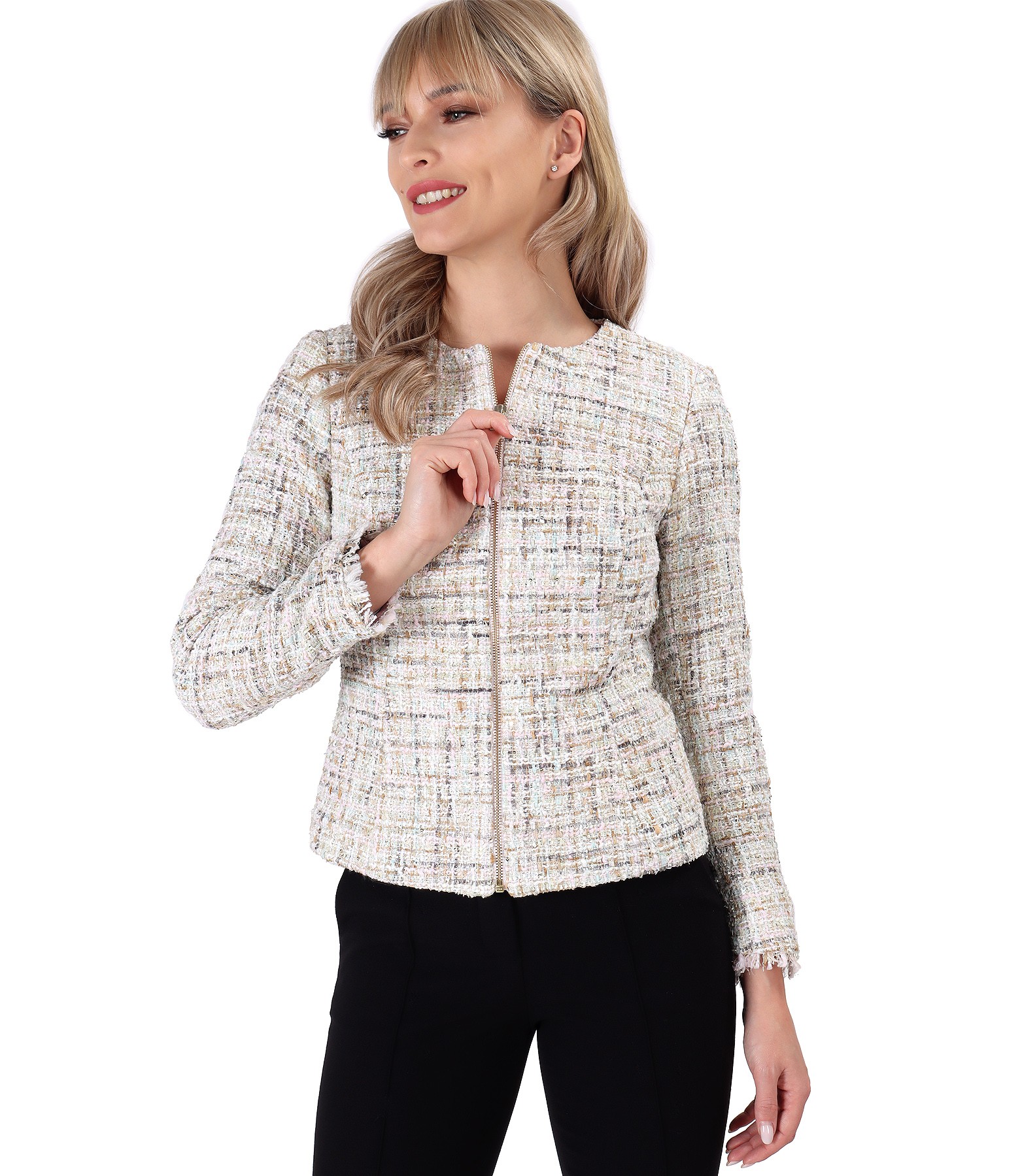 Jacket without collar made of multicolored loops with sequins and thread effect,padded,with round neckline and fringed at the sleeves.Closes with a zipper in the middle face.