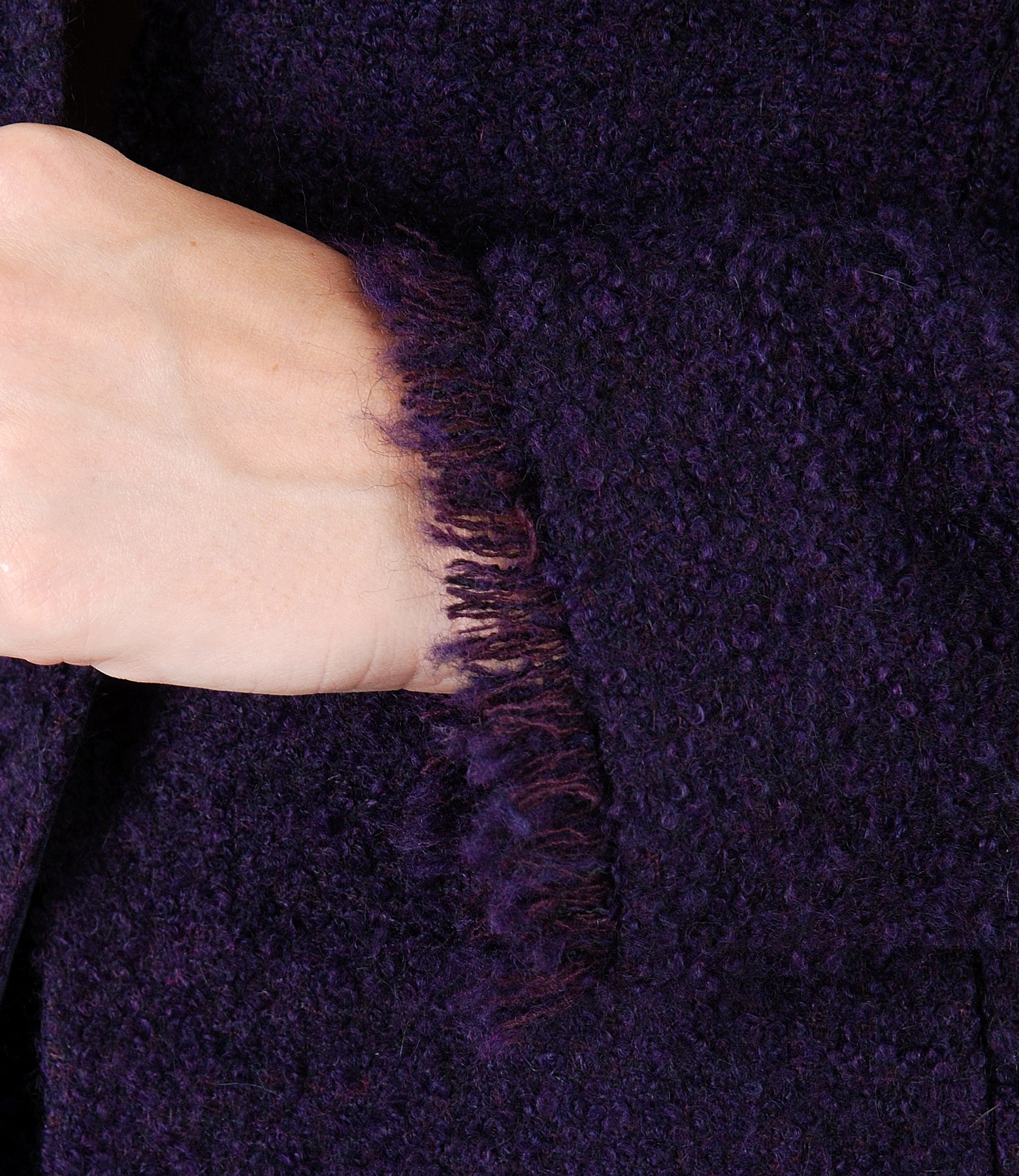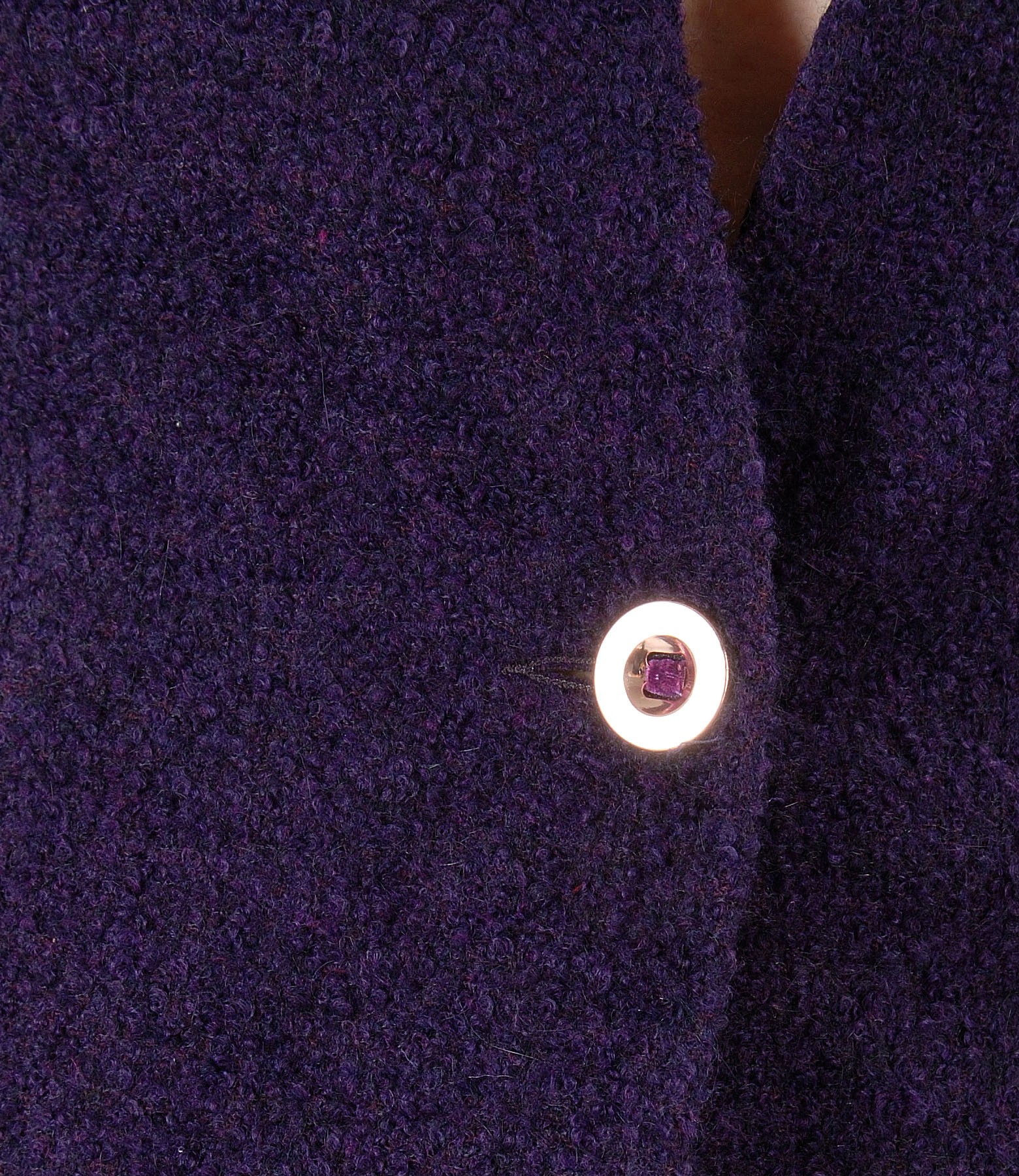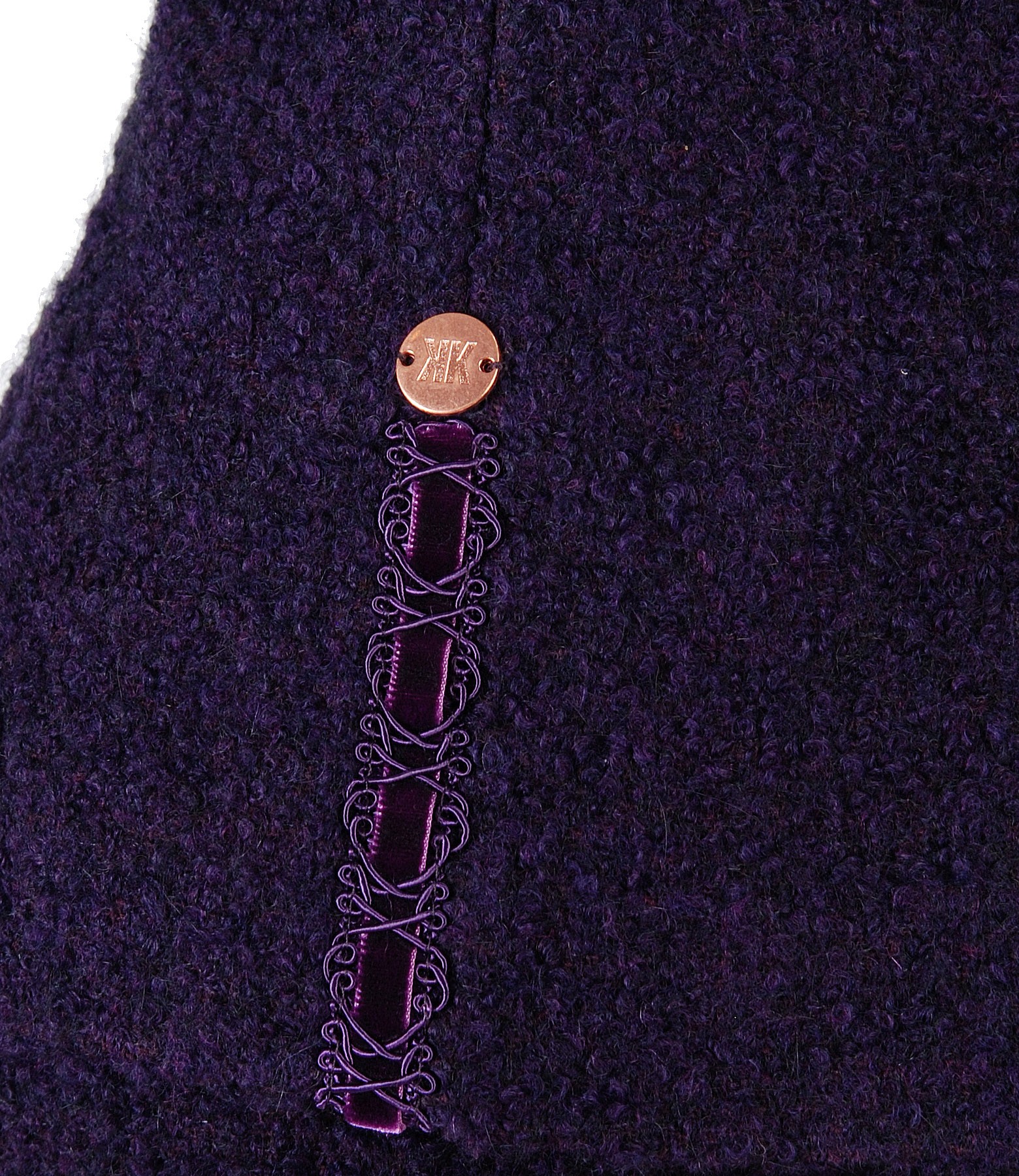 Jacket with loops and alpaca wool, padded, with front velvet band, tunic collar, deep low-cut neck and fringes at the edges. Closes with metallic front button.
